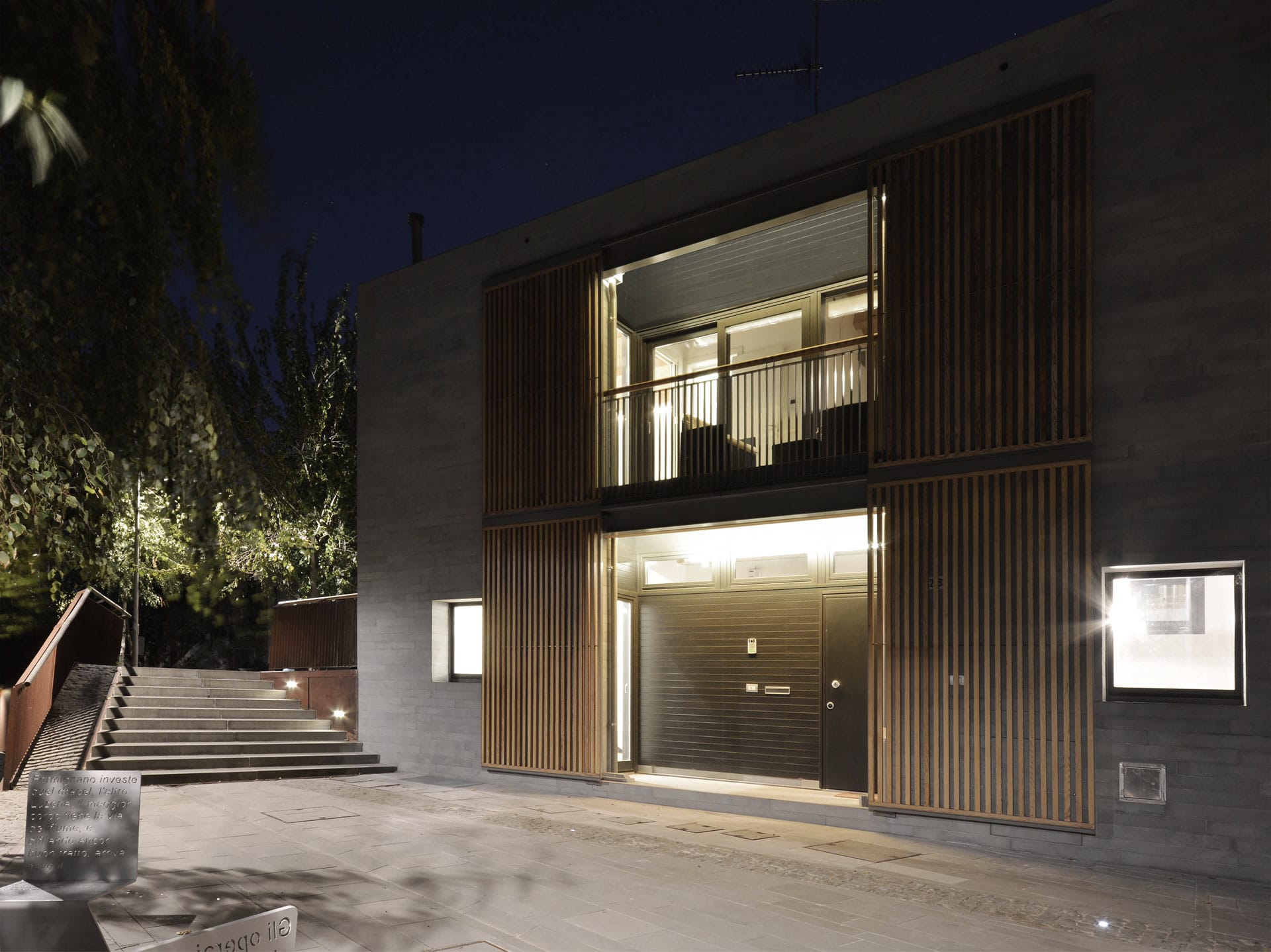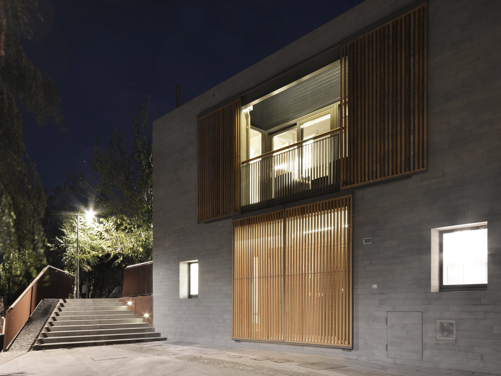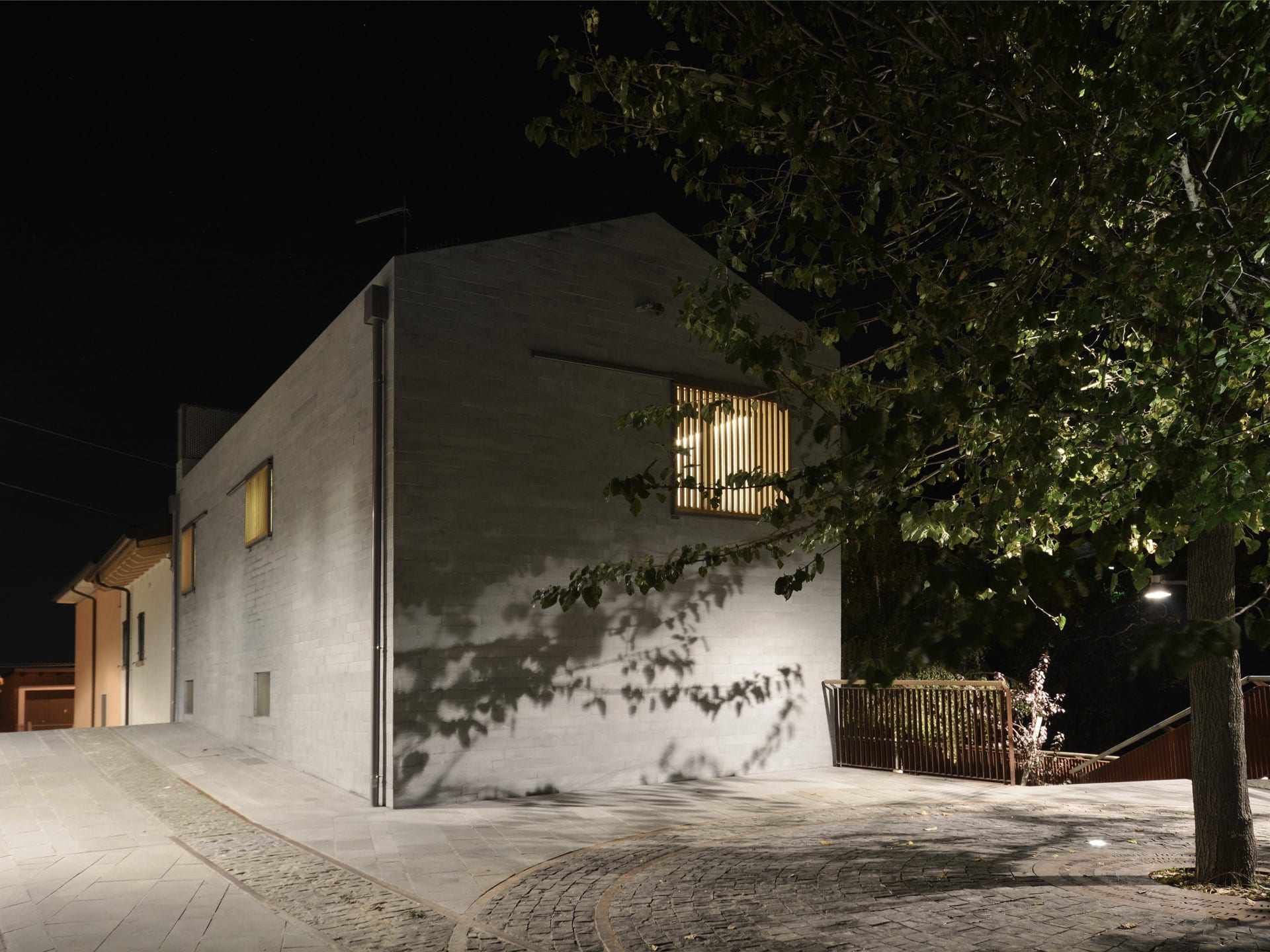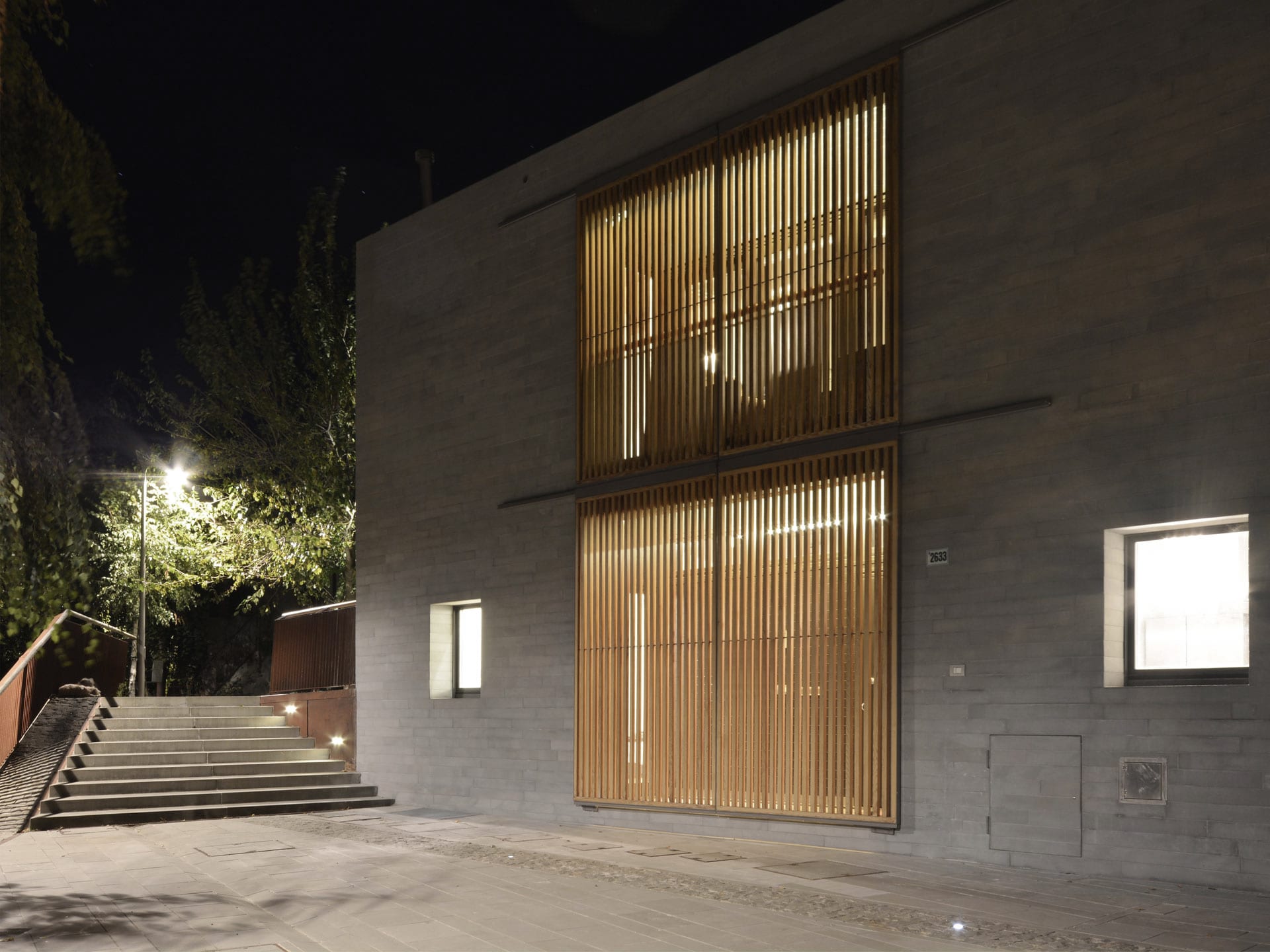 In contrasto con l’aspetto massivo dei paramenti murari sono gli elementi oscuranti che con l’alternanza di sottili listelli di legno scorrono su tutte le aperture dell’edificio, portico e loggia compresi. Questi elementi, oltre a fornire introspezione garantiscono la regolazione della radiazione solare e la ventilazione naturale degli spazi interni. Durante le ore notturne la luce interna che filtra attraverso gli elementi oscuranti conferisce all’edificio una certa leggerezza in netto contrasto con il suo aspetto alla luce del sole.