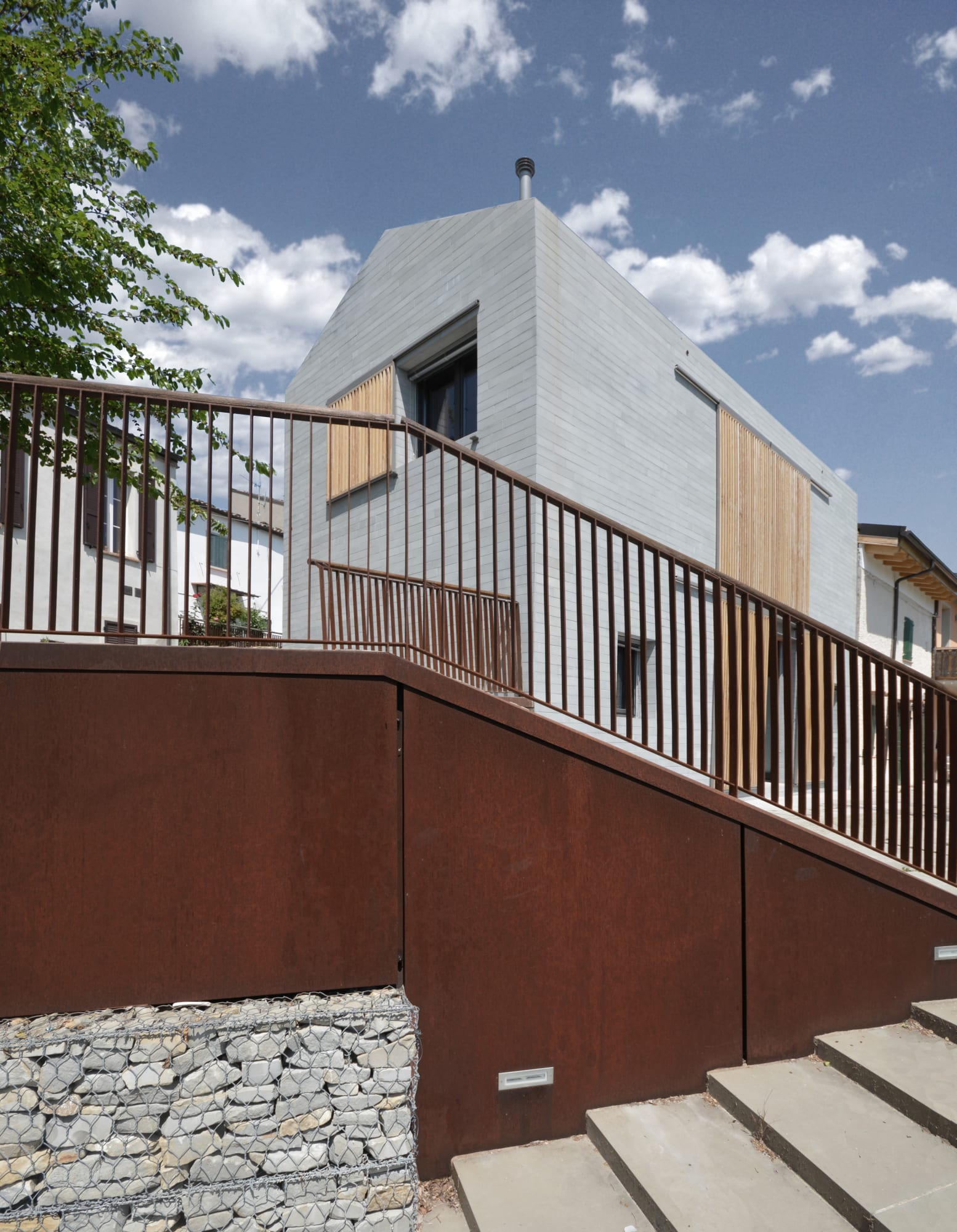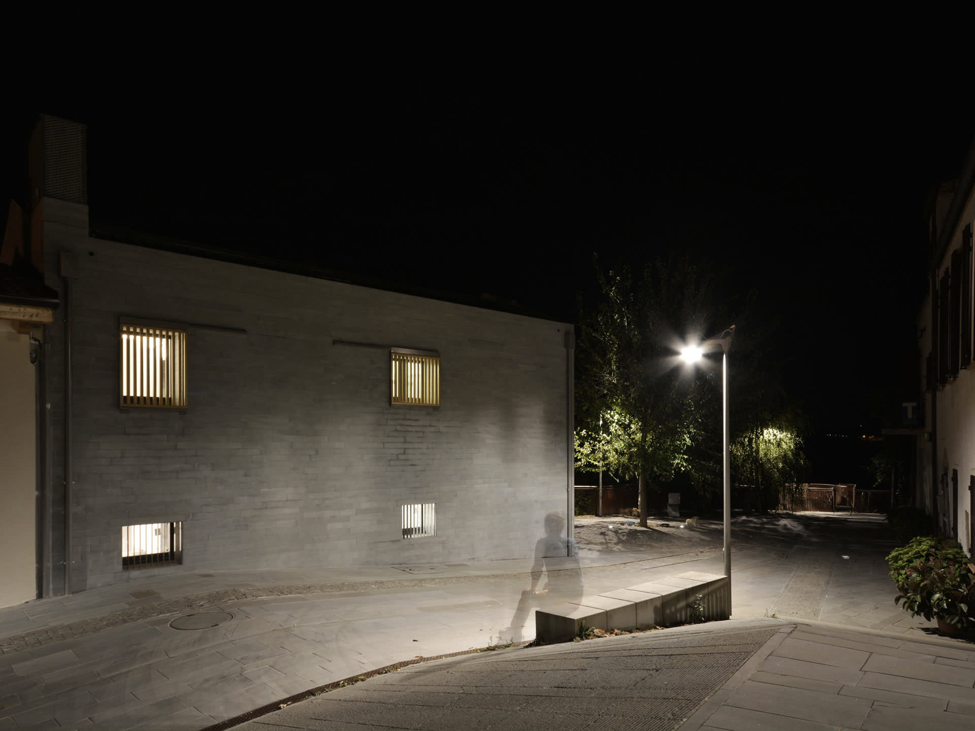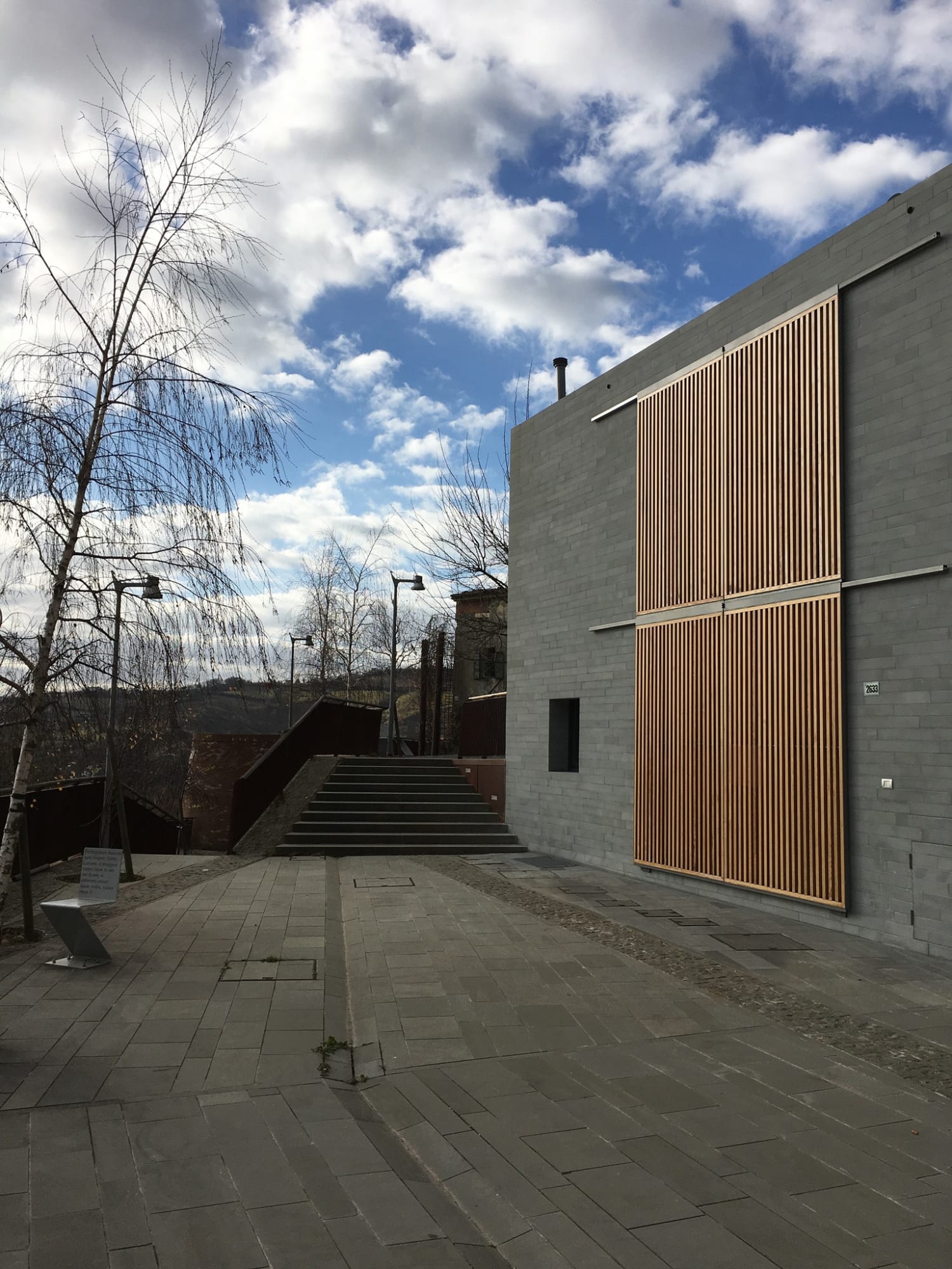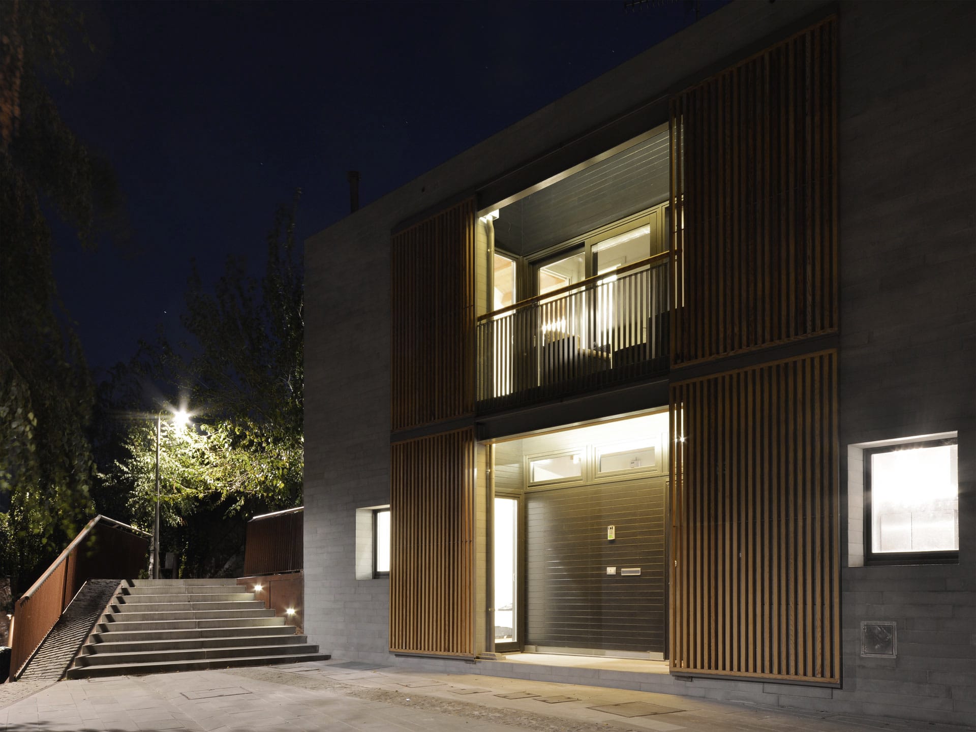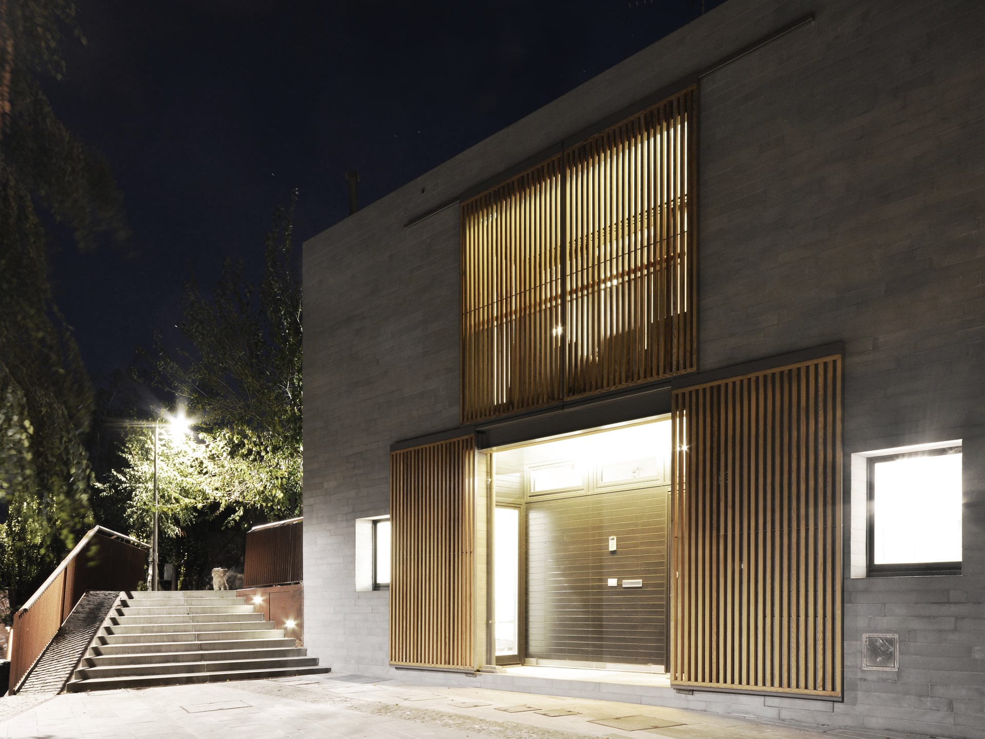 In contrasto con l’aspetto massivo dei paramenti murari sono gli elementi oscuranti che con l’alternanza di sottili listelli di legno scorrono su tutte le aperture dell’edificio, portico e loggia compresi. Questi elementi, oltre a fornire introspezione garantiscono la regolazione della radiazione solare e la ventilazione naturale degli spazi interni. Durante le ore notturne la luce interna che filtra attraverso gli elementi oscuranti conferisce all’edificio una certa leggerezza in netto contrasto con il suo aspetto alla luce del sole.