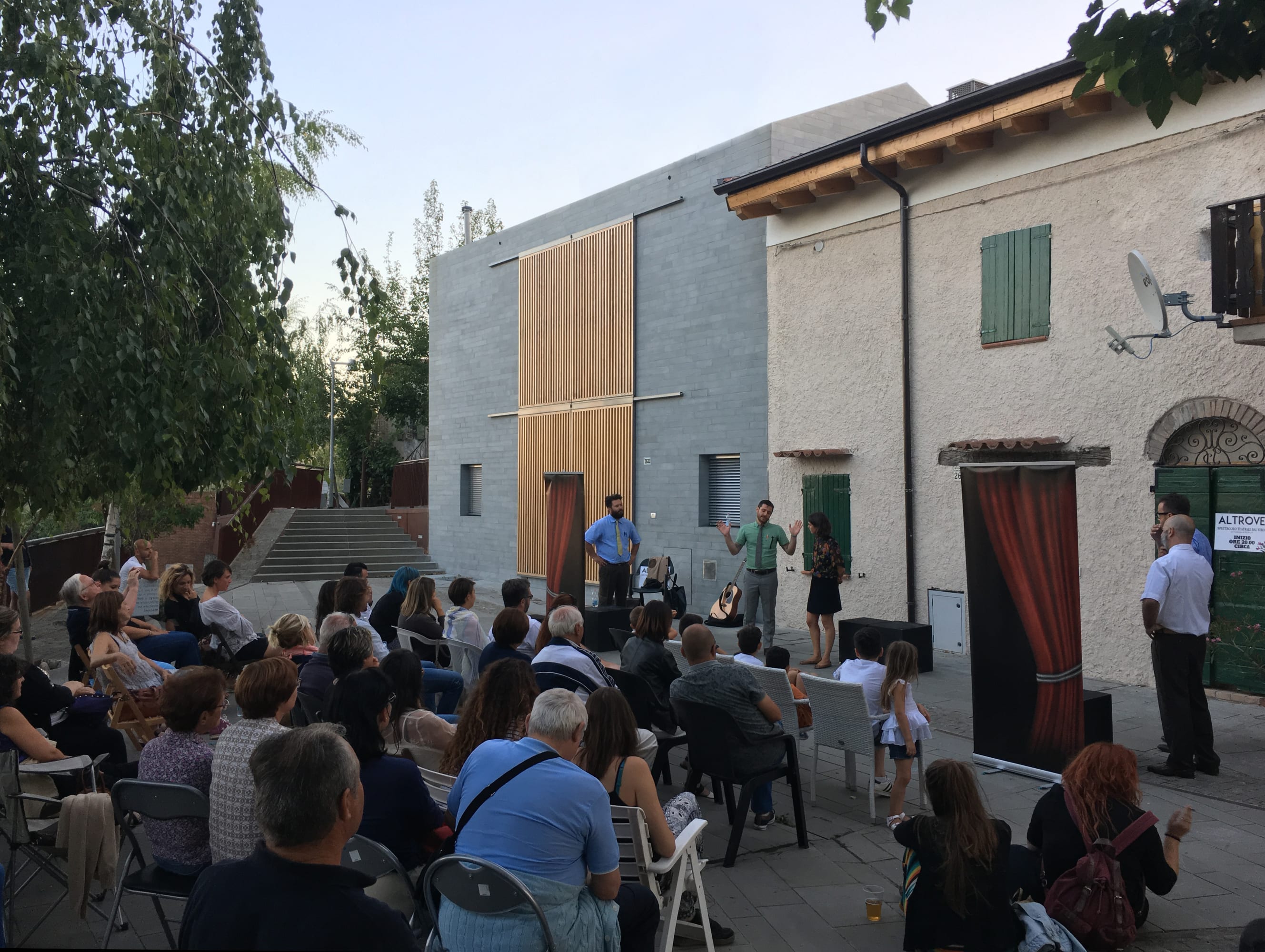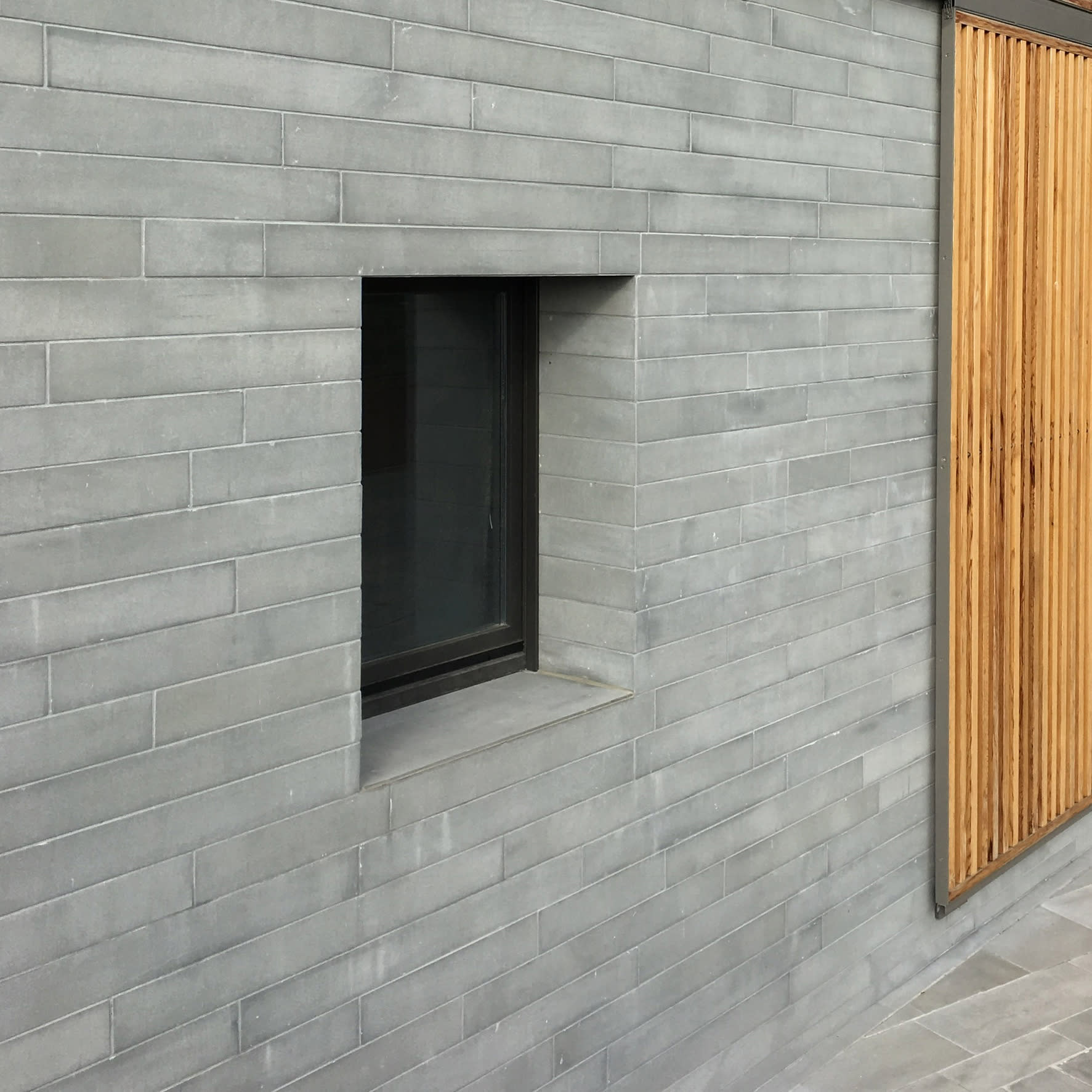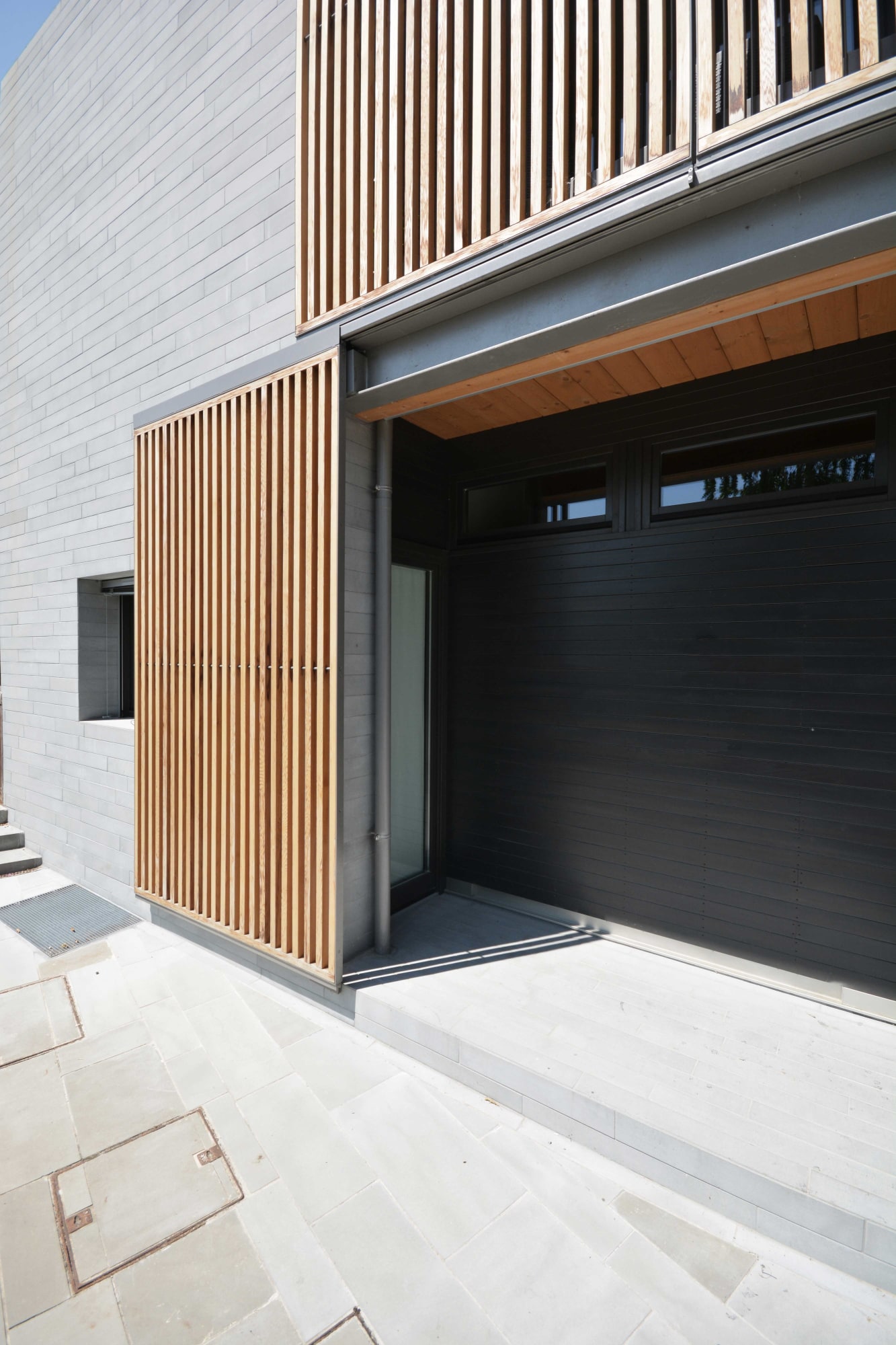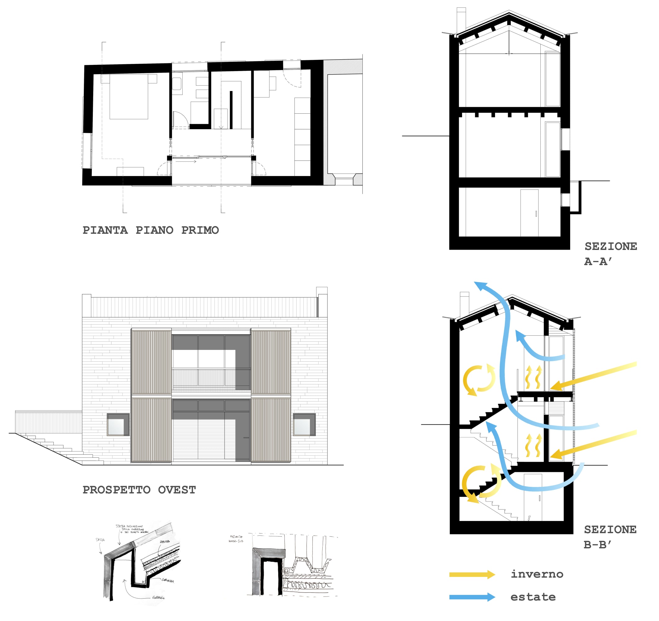 In contrasto con l’aspetto massivo dei paramenti murari sono gli elementi oscuranti che con l’alternanza di sottili listelli di legno scorrono su tutte le aperture dell’edificio, portico e loggia compresi. Questi elementi, oltre a fornire introspezione garantiscono la regolazione della radiazione solare e la ventilazione naturale degli spazi interni. Durante le ore notturne la luce interna che filtra attraverso gli elementi oscuranti conferisce all’edificio una certa leggerezza in netto contrasto con il suo aspetto alla luce del sole.