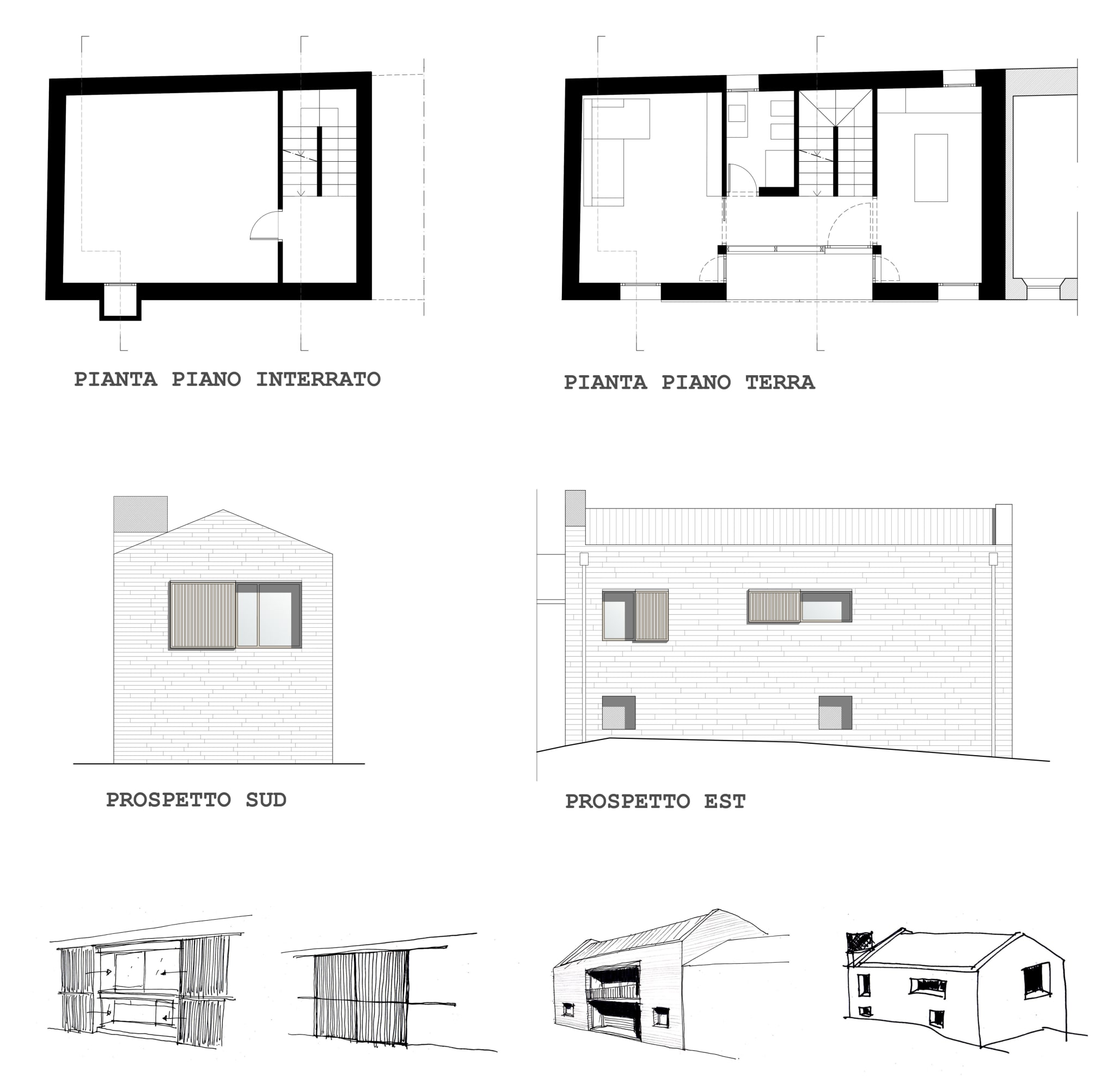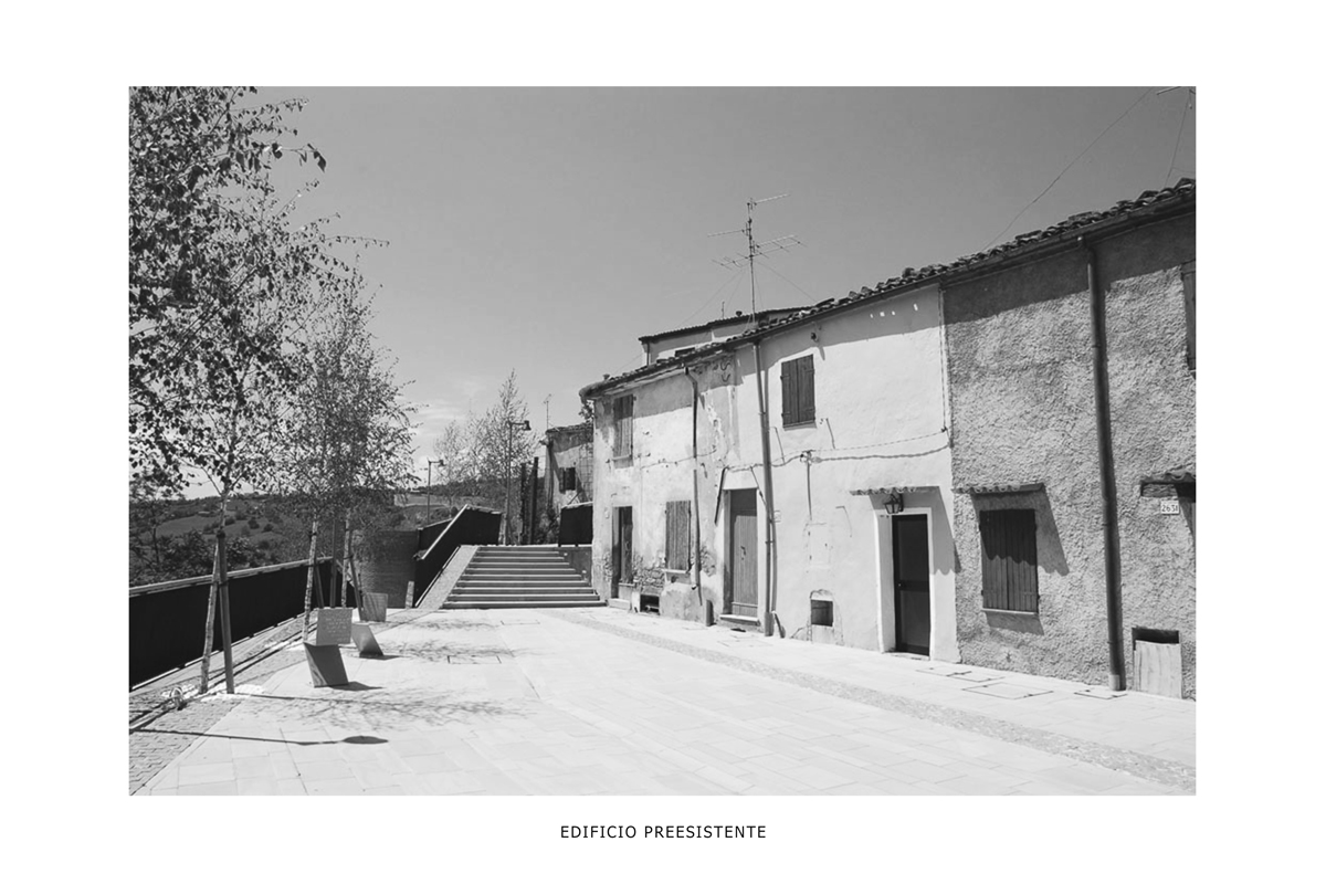 “Architetto, questa era la casa di mio nonno: lui era un minatore ed è morto in miniera; il suo progetto deve rendere onore alla sua memoria.” Partendo dal presupposto in descrizione, il progetto prevede una morfologia stereometrica, massiva, completamente connotata dall’utilizzo ortodosso della pietra locale. L’edificio, ancora in fase di costruzione, appare come un elemento lapideo uniforme che viene cavato mediante sottrazione di volume ricavando finestre, portico e loggia, parafrasando le operazioni di cavatura operate nella miniera locale. La purezza della forma è tale da eliminare qualsiasi elemento di decoro o semplicemente tecnologico come scossaline o cornicioni. La pietra diventa così la protagonista del progetto, richiamando per altro lo stesso materiale che si trova nella pavimentazione e nei rivestimenti murari del borgo nel quale l’edificio è collocato.