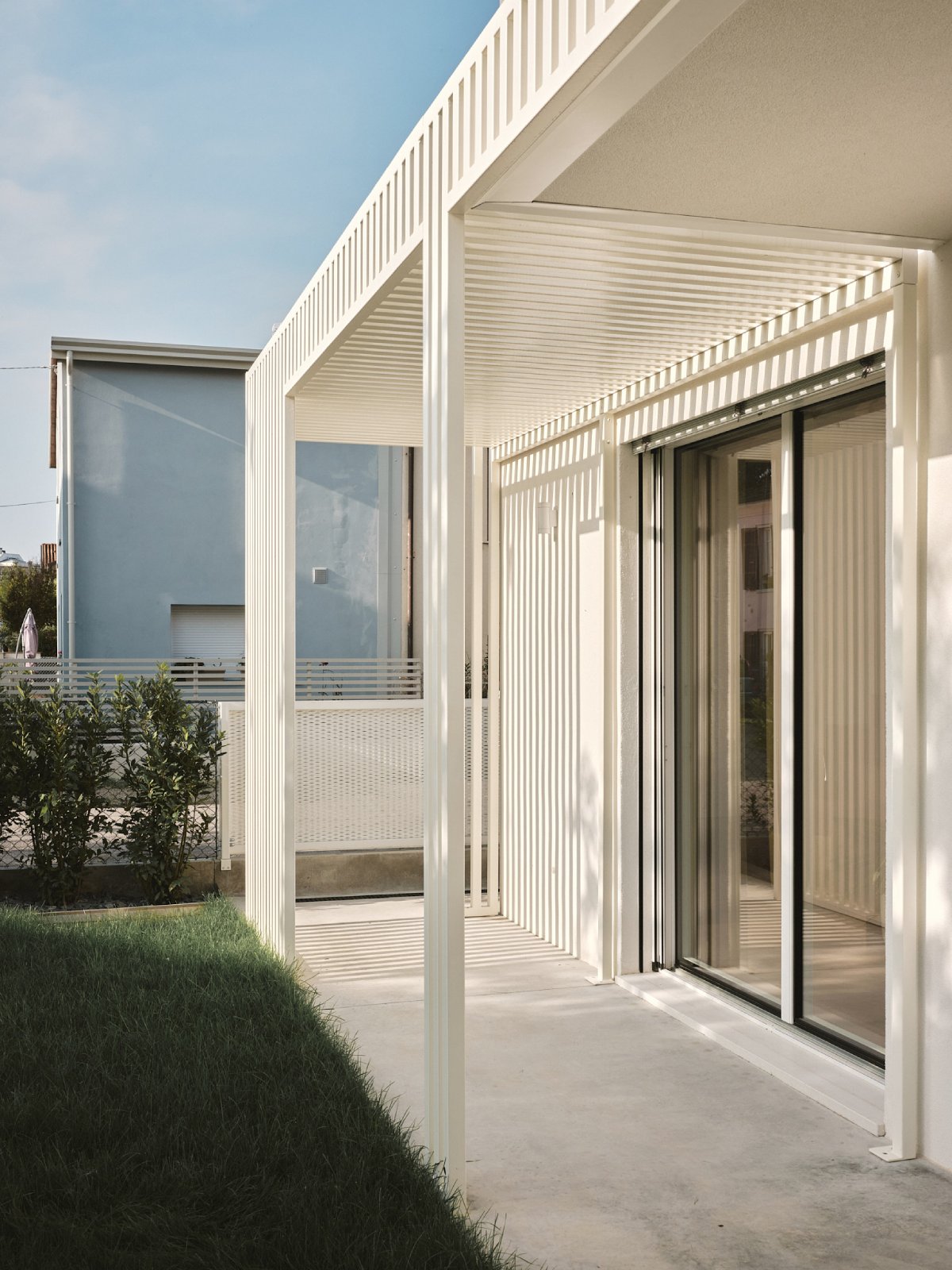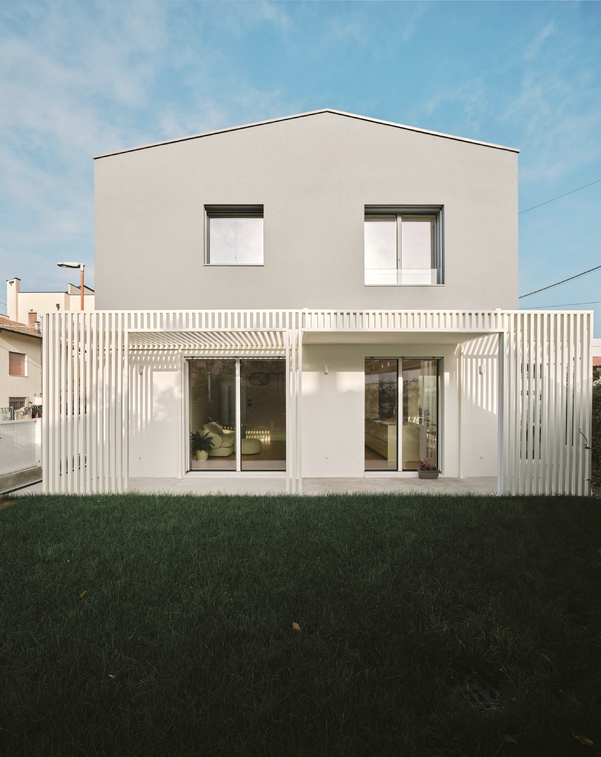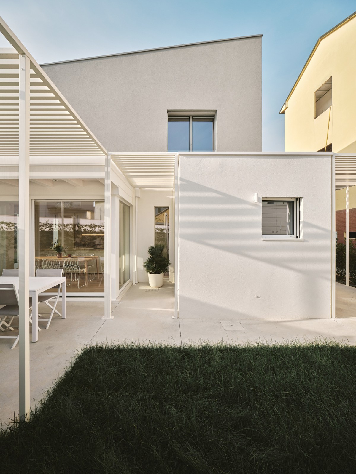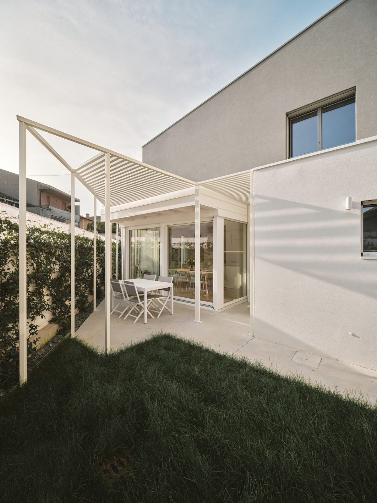 Il piano terra viene integrato da pergolati che hanno la duplice funzione di schermature solari e di elementi capaci di favorire l’introspezione del giardino interno.