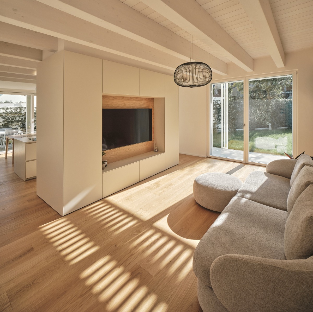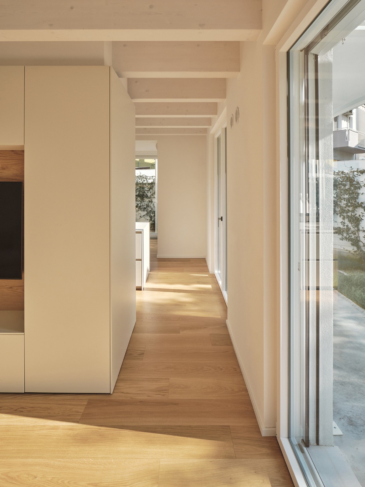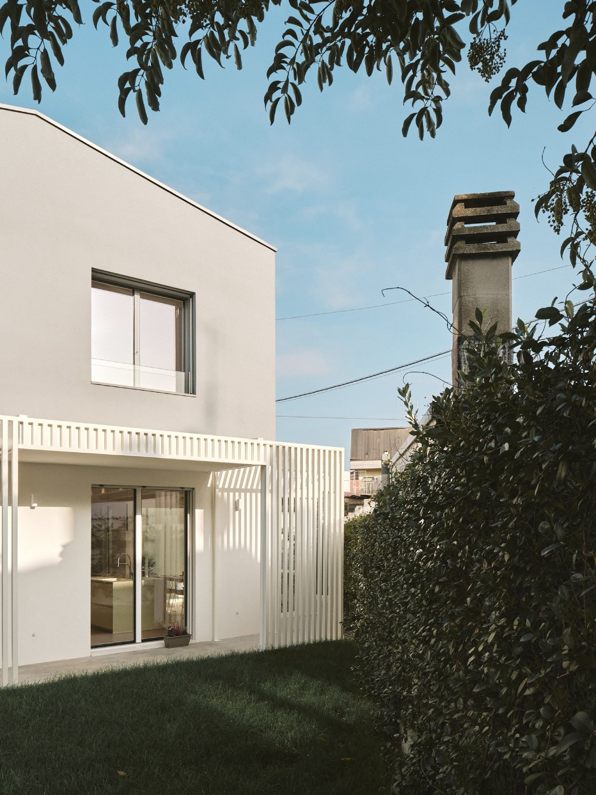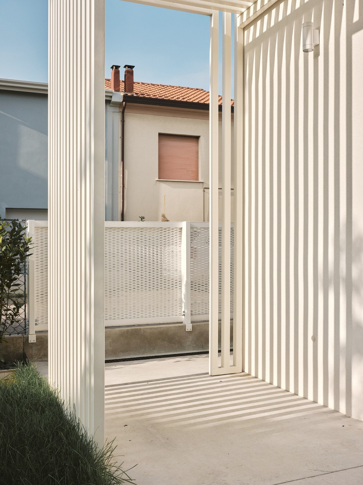 Il piano terra viene integrato da pergolati che hanno la duplice funzione di schermature solari e di elementi capaci di favorire l’introspezione del giardino interno.