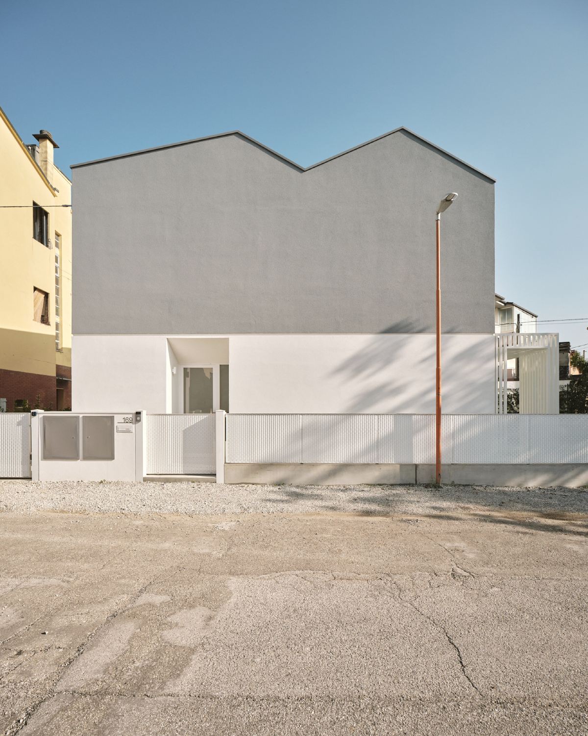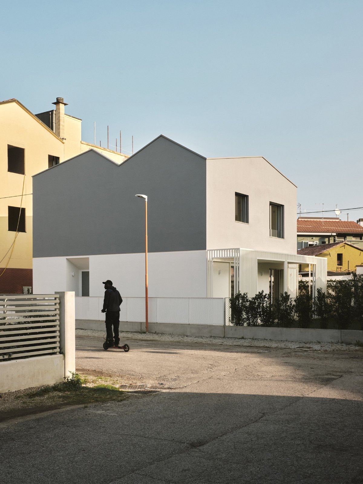 La morfologia dell’edificio è caratterizzata da una cambio di colore che evidenzia il piano terra, dove è collocata la giorno, dal piano primo dove viene collocata la zona notte.
