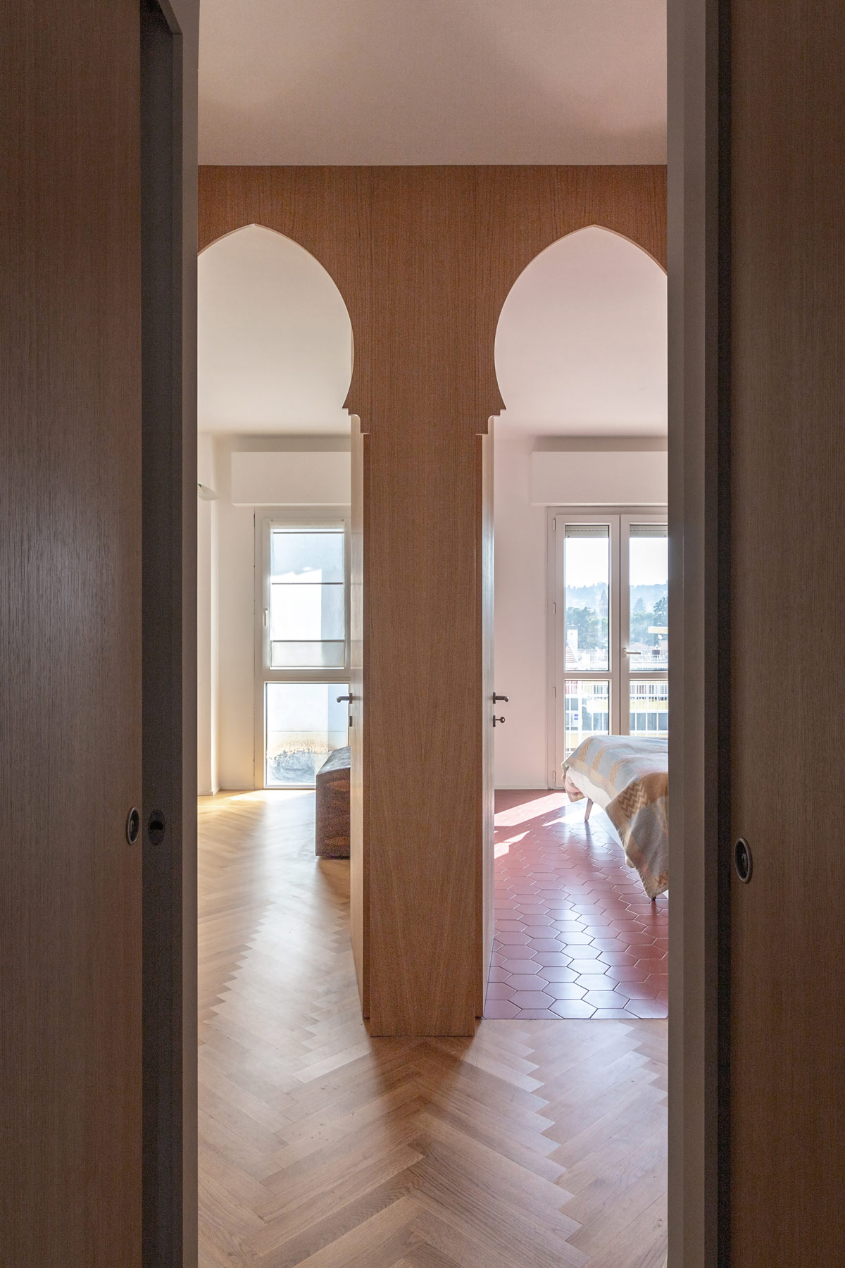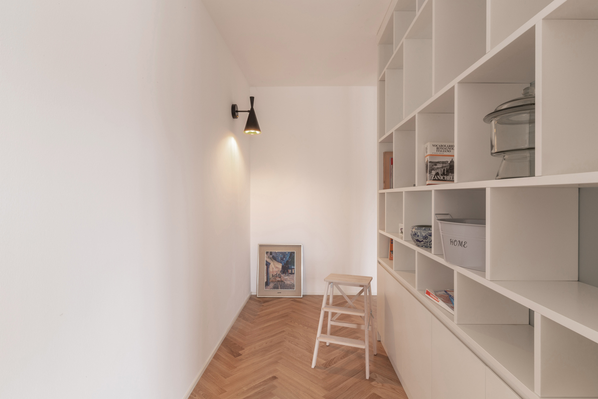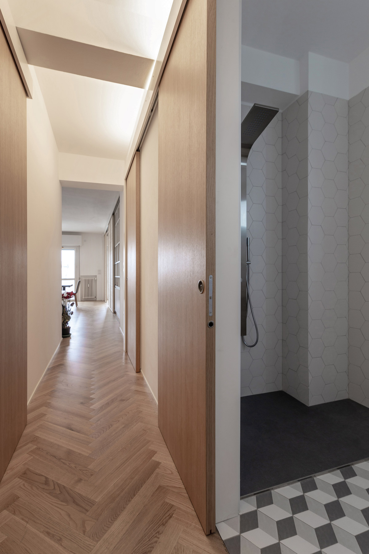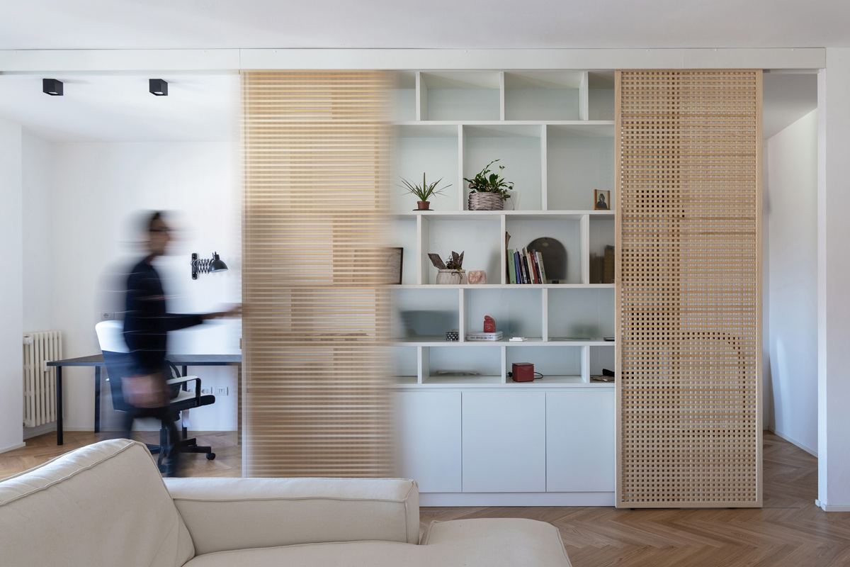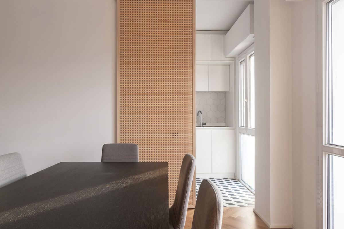 Si tratta di un progetto di architettura di interni, l’intervento riguarda la ristrutturazione di un appartamento con l’obiettivo di realizzare spazi flessibili. Gli ambienti principali risultano lineari e minimali, con pavimento in legno ed arredi e superfici generalmente bianche. Gli spazi di servizio sono caratterizzati, al contrario, da pavimenti con texture esagonali colorate con l’intento di realizzare un patchwork che contrasta rispetto la sobrietà degli ambienti principali. le porte scorrevoli sono state progettate come pannelli lignei che slittano sulle pareti. In alcuni casi sono pannelli in legno opaco, in altri sono griglie lignee traforate allo scopo di fare permeare la luce garantendo nel contempo la privacy visiva. Le porte delle camere da letto, disposte in fondo al corridoio, riprendono la forma dell’architettura araba: la proprietaria fin da piccola veniva addormentata al racconto de “le mille e una notte”.