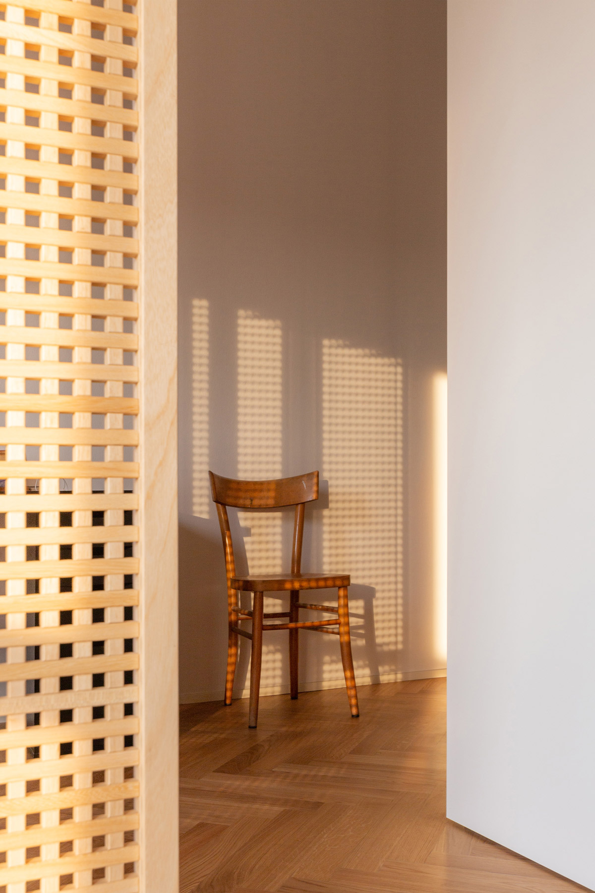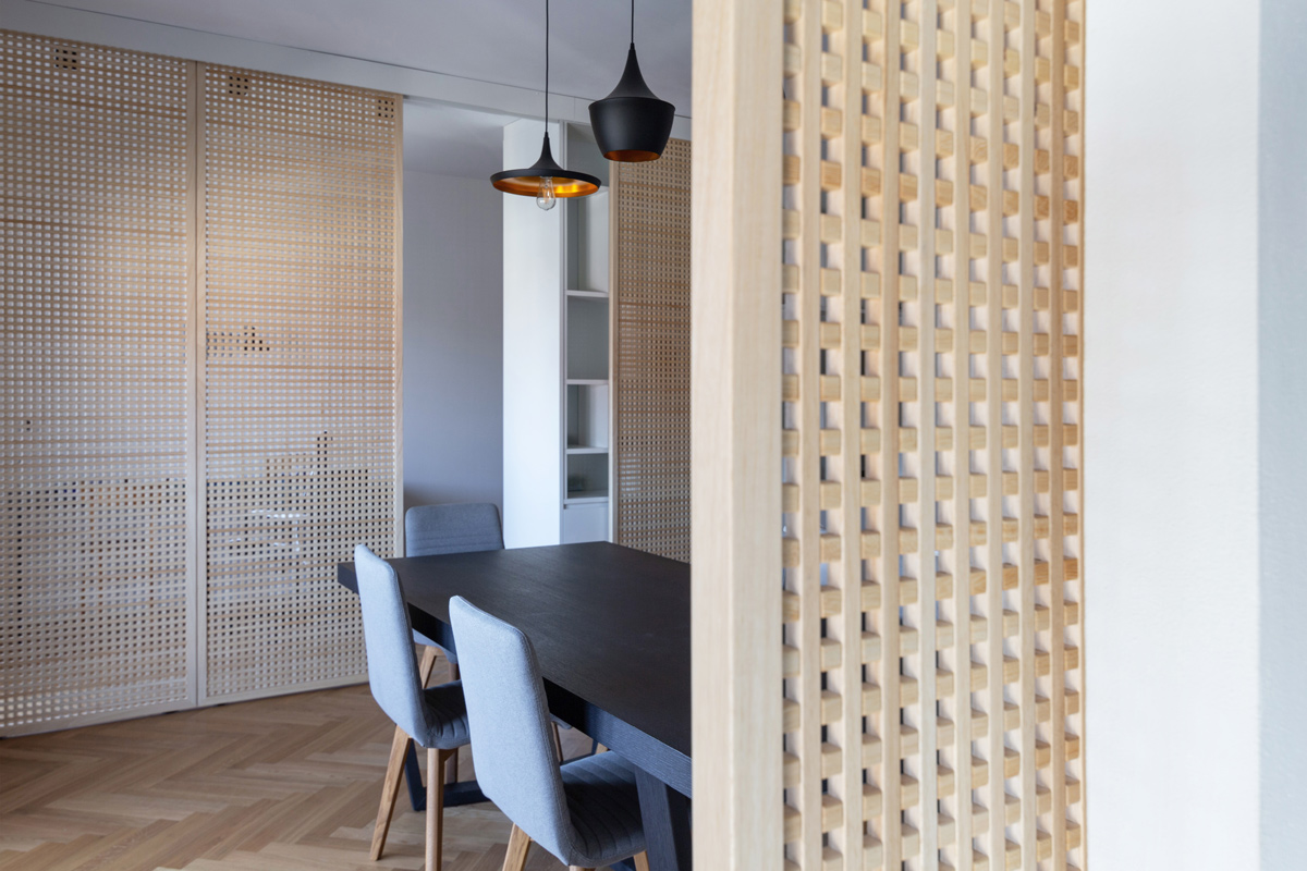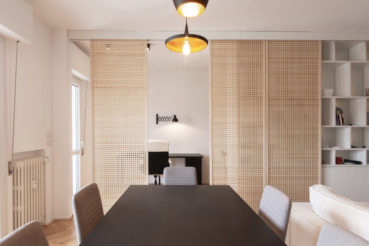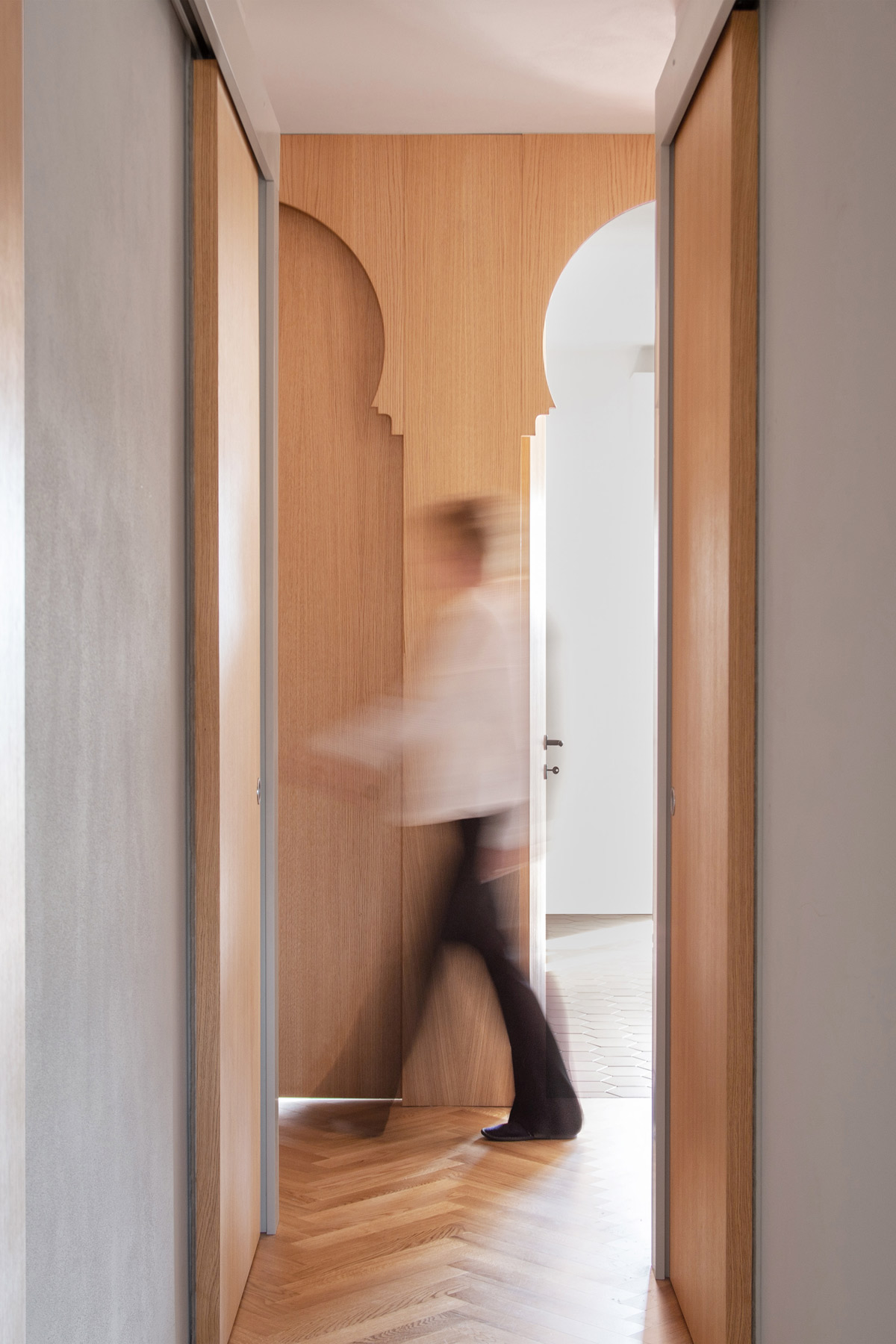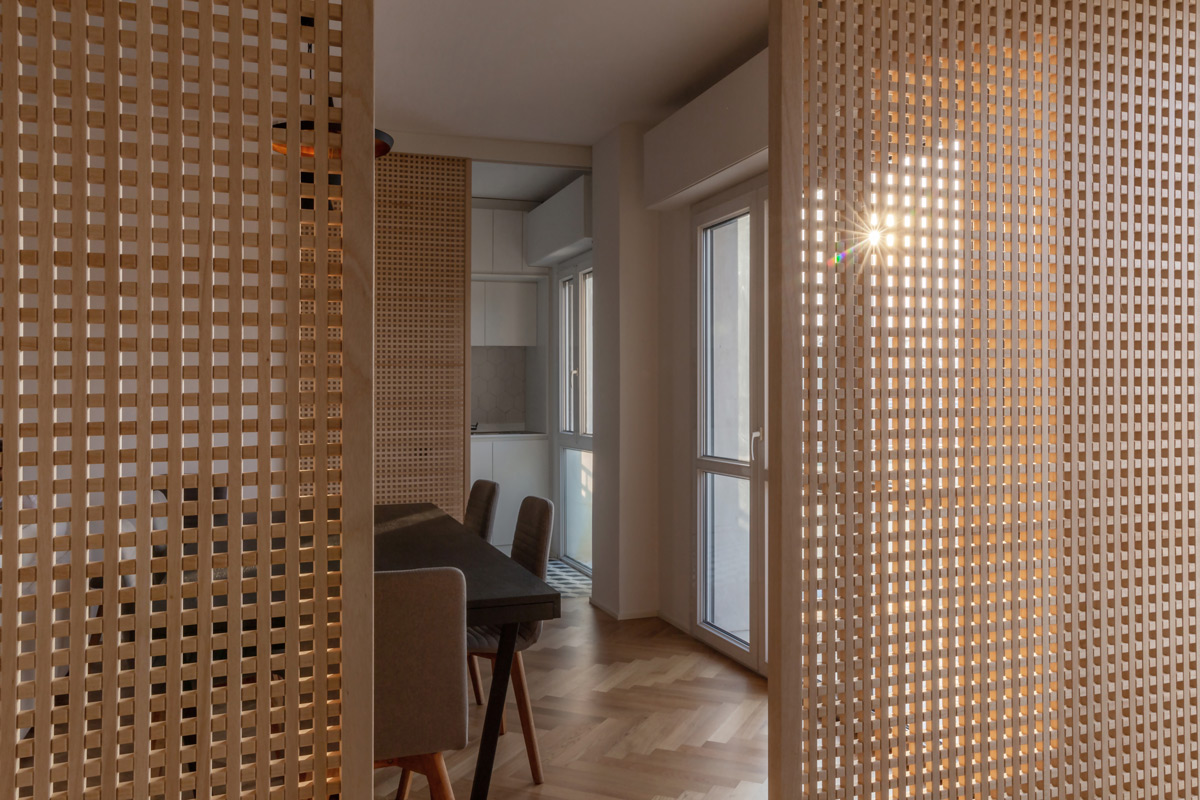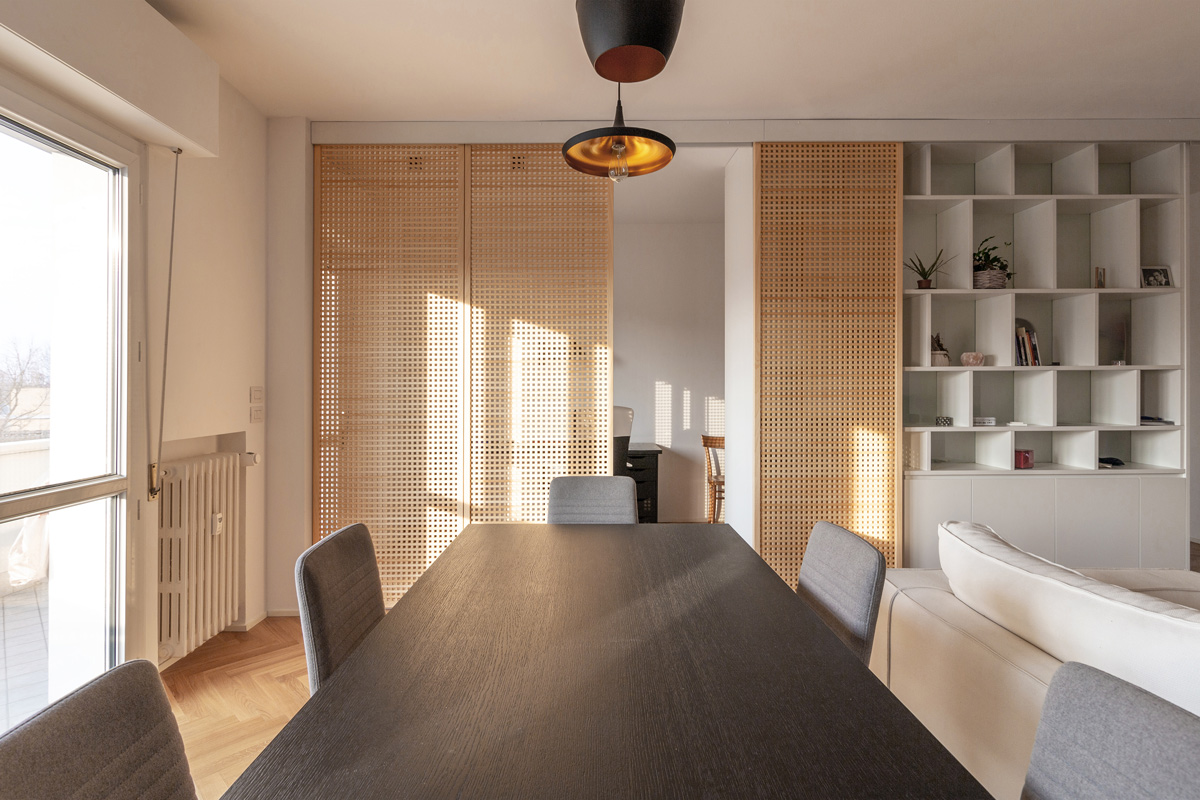Si tratta di un progetto di architettura di interni, l’intervento riguarda la ristrutturazione di un appartamento con l’obiettivo di realizzare spazi flessibili. Gli ambienti principali risultano lineari e minimali, con pavimento in legno ed arredi e superfici generalmente bianche. Gli spazi di servizio sono caratterizzati, al contrario, da pavimenti con texture esagonali colorate con l’intento di realizzare un patchwork che contrasta rispetto la sobrietà degli ambienti principali. le porte scorrevoli sono state progettate come pannelli lignei che slittano sulle pareti. In alcuni casi sono pannelli in legno opaco, in altri sono griglie lignee traforate allo scopo di fare permeare la luce garantendo nel contempo la privacy visiva. Le porte delle camere da letto, disposte in fondo al corridoio, riprendono la forma dell’architettura araba: la proprietaria fin da piccola veniva addormentata al racconto de “le mille e una notte”.