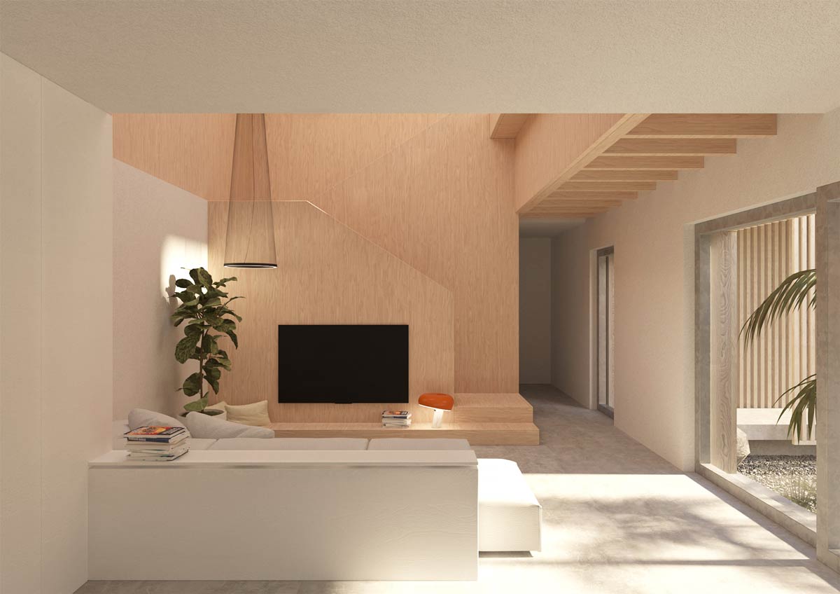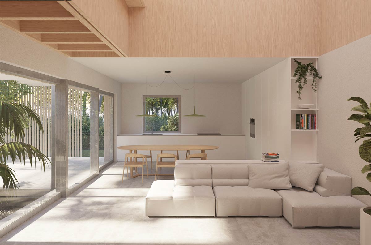 Il piano terra accoglie la vita quotidiana nella sua dimensione più aperta e condivisa: ingresso e ampia zona giorno si articolano attorno a soggiorno e cucina, in diretto dialogo con uno spazio esterno coperto da pergolato. Gli ambienti di servizio — studio, bagno, vano tecnico e autorimessa — sono disposti con chiarezza funzionale, con accessi autonomi che non interferiscono con la sequenza abitativa.