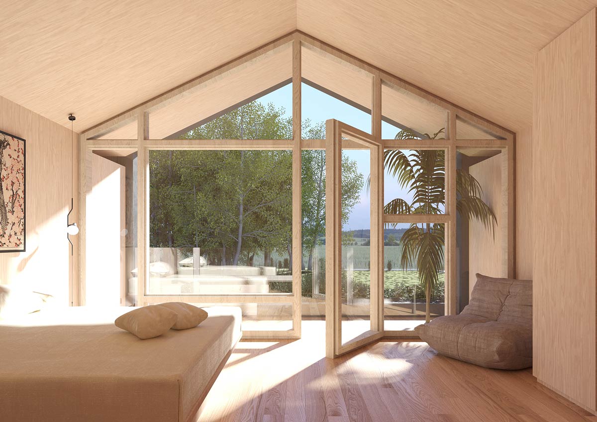 Il progetto è sviluppato con approccio bioclimatico, raggiungendo prestazioni energetiche prossime allo zero. L’involucro, l’orientamento e le ampie aperture a sud ed est massimizzano radiazione solare, mentre frangisole impacchettabili proteggono dal surriscaldamento estivo. La struttura portante in XLAM è integrata da pochi elementi in acciaio e cordoli in cemento armato, equilibrando leggerezza e stabilità.