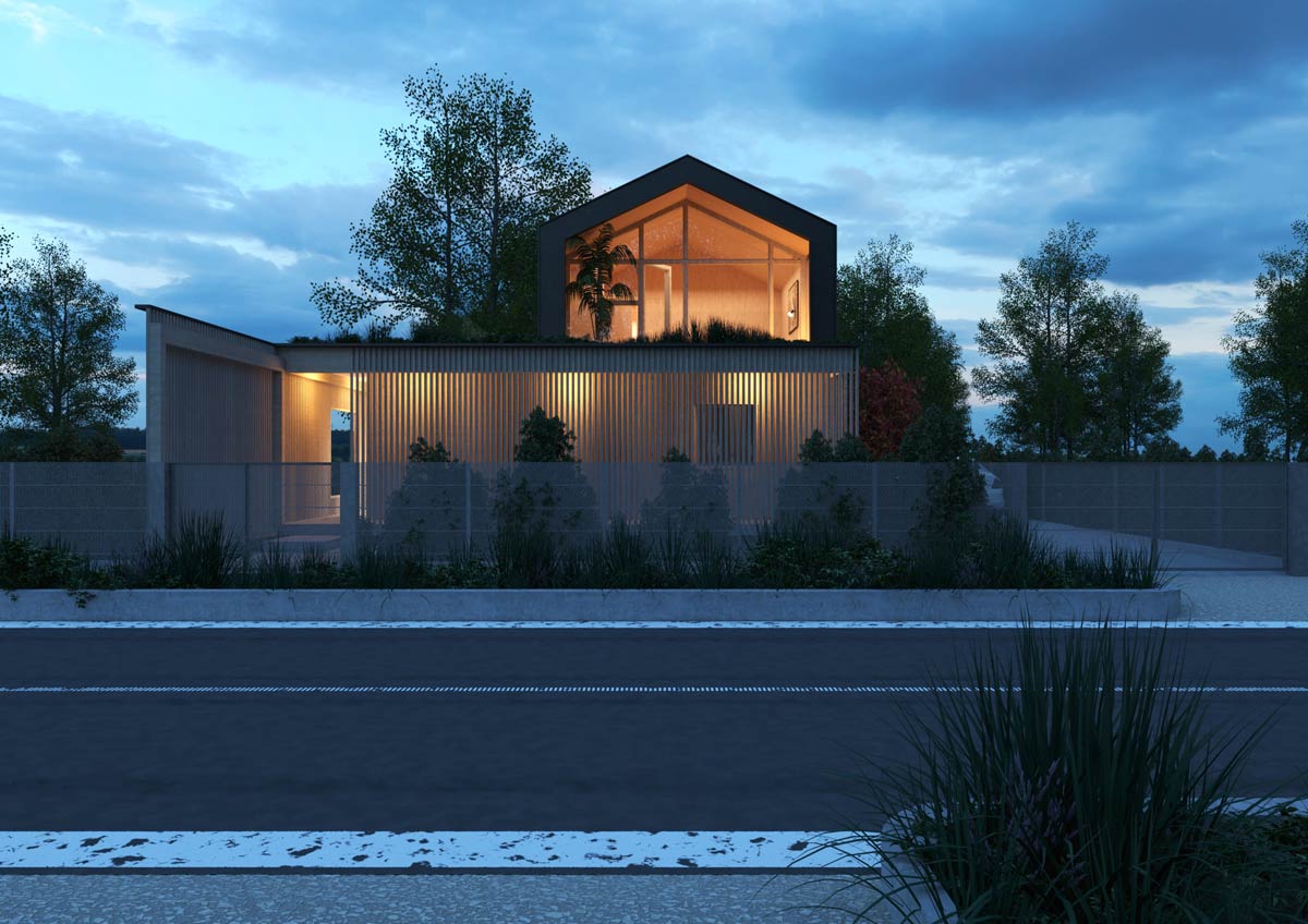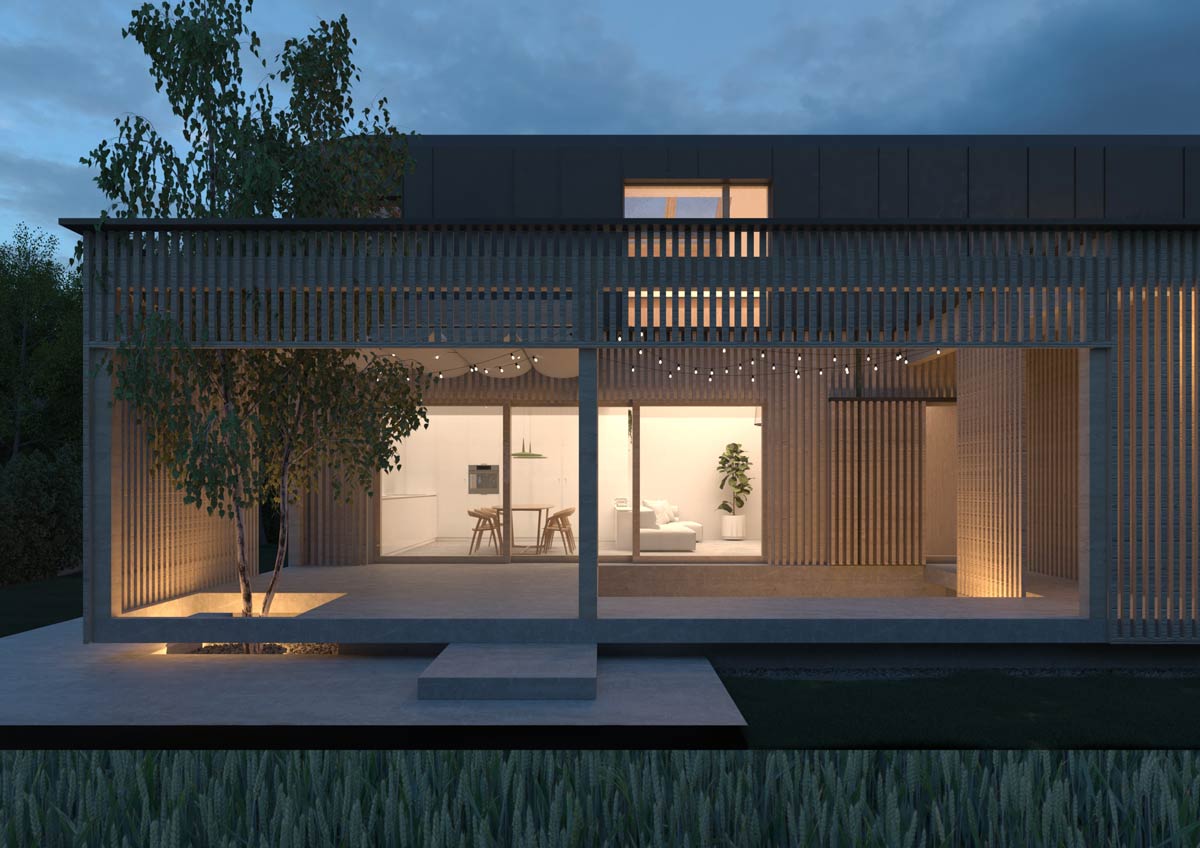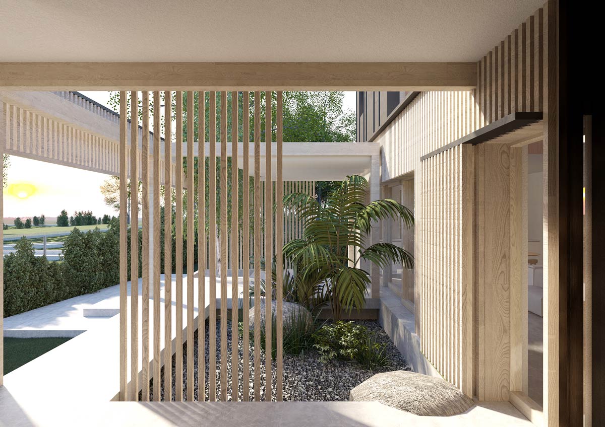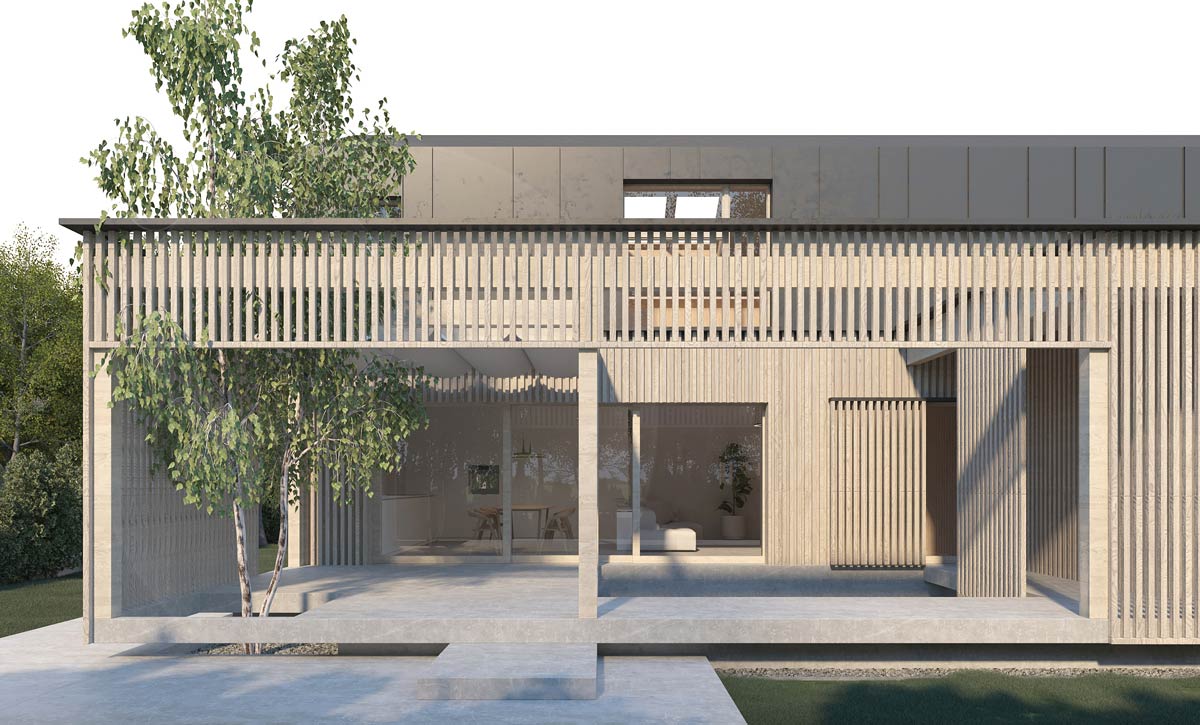 Una pensilina continua, di profondità contenuta, avvolge parzialmente il volume al piano terra: non un semplice elemento di protezione, ma un dispositivo architettonico che costruisce una zona di transizione tra interno ed esterno. I listelli lignei filtrano luce e sguardo, garantendo privacy verso la strada e rafforzando il carattere introverso senza rinunciare all’apertura verso il giardino.