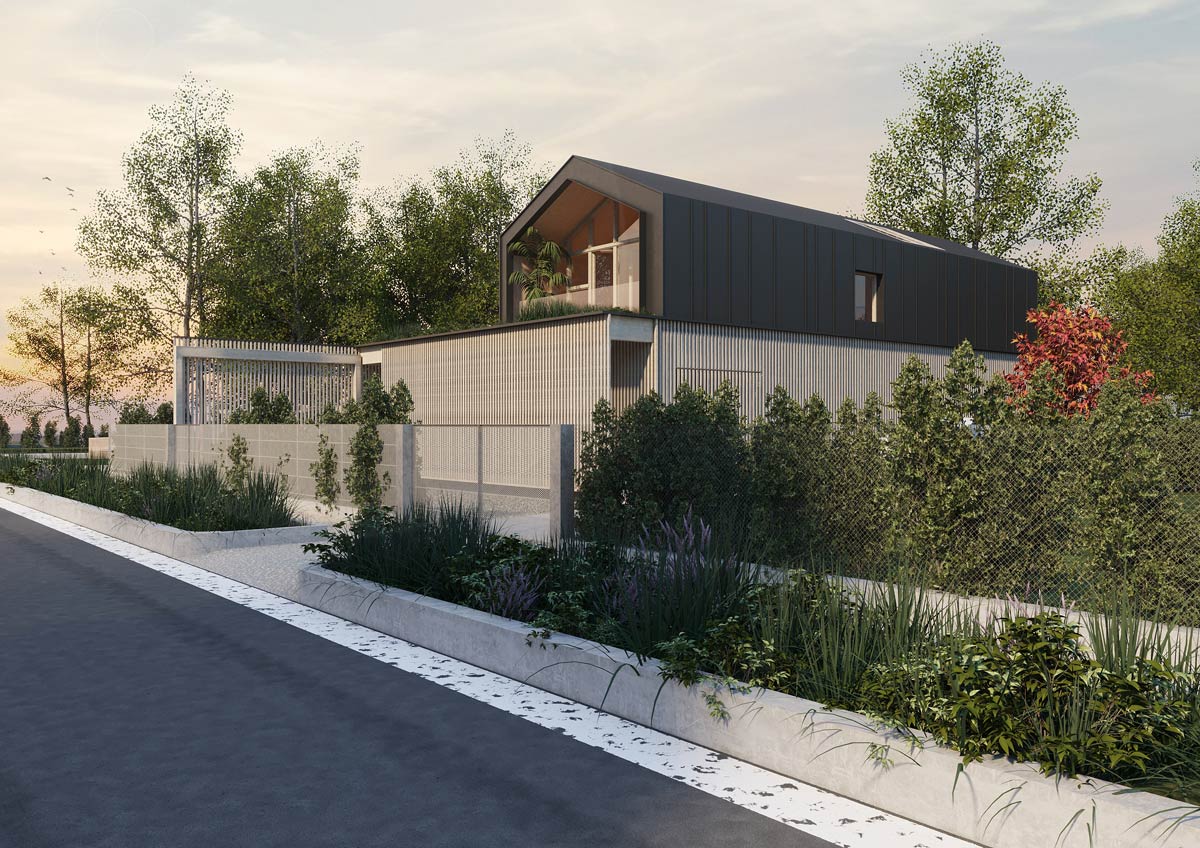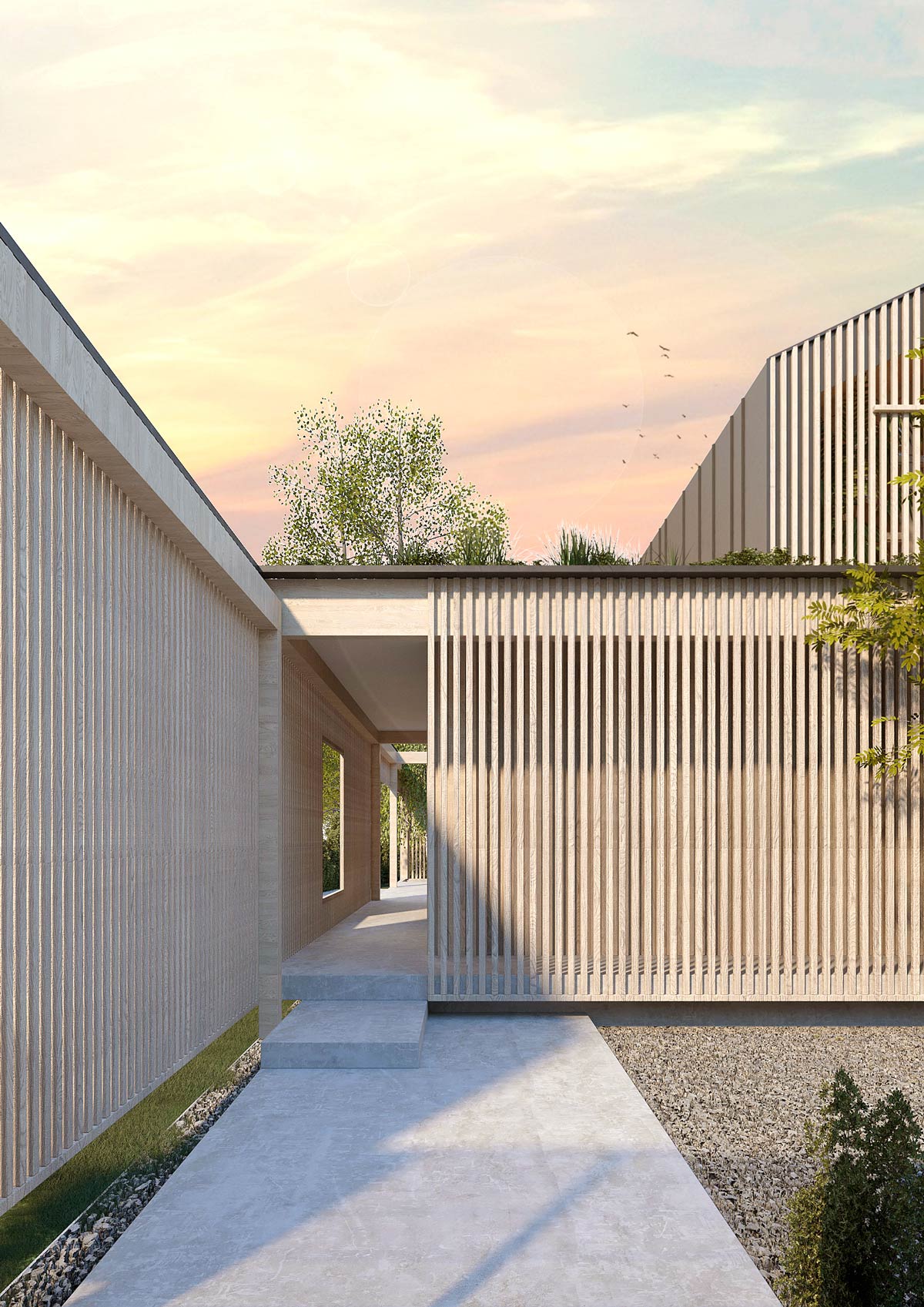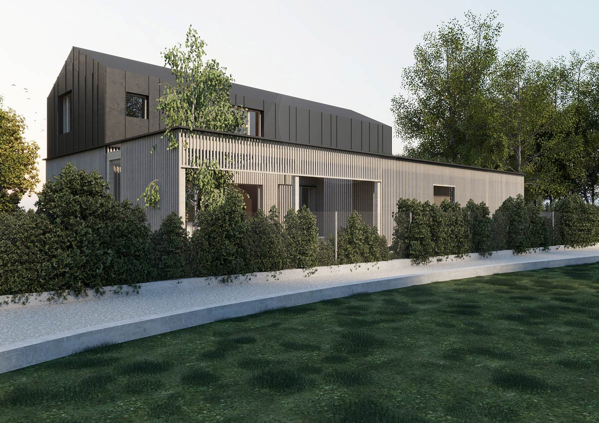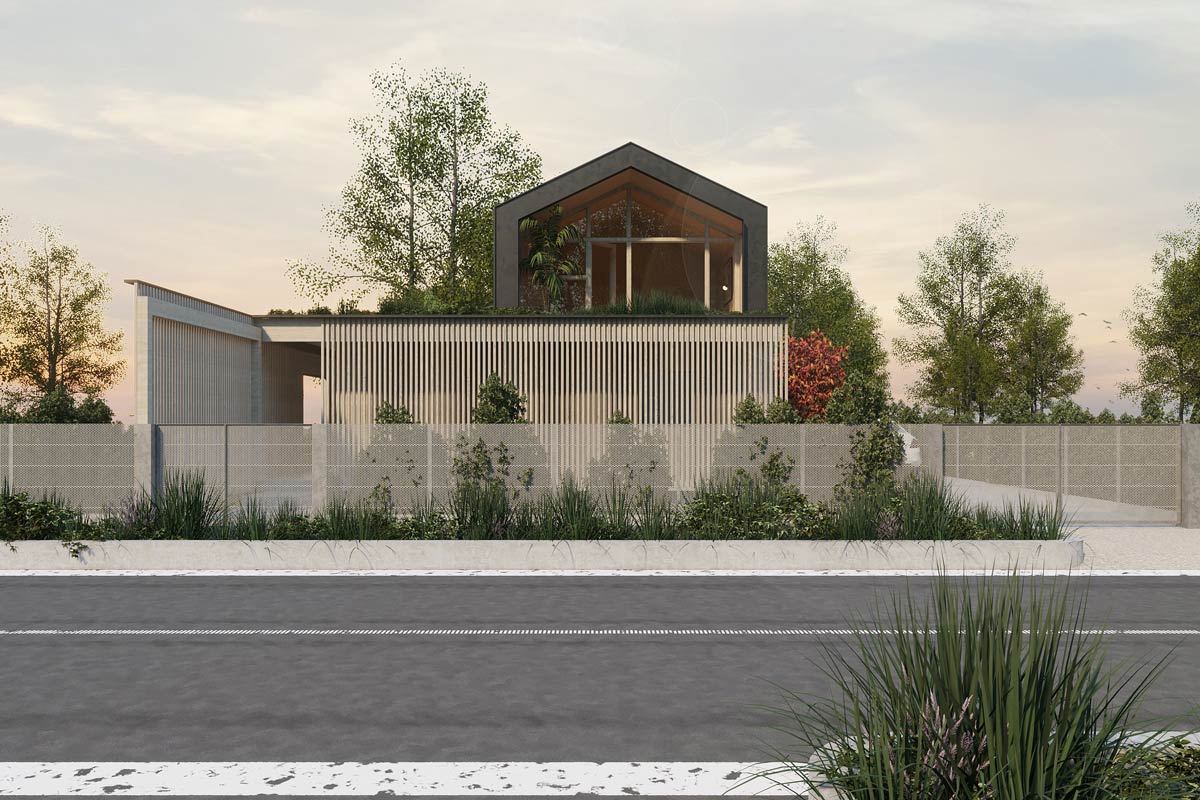 L’edificio prende forma come una casa unifamiliare compatta, articolata su due livelli, che instaura con il suolo e il paesaggio un rapporto di prossimità misurata piuttosto che di affermazione formale. Sollevandosi lievemente rispetto al piano stradale, definisce una soglia abitata che media con discrezione il passaggio dallo spazio pubblico alla dimensione domestica.