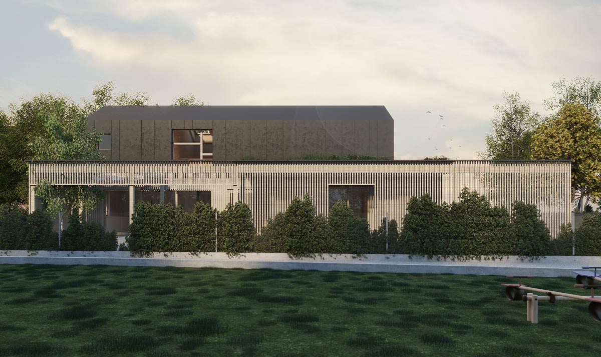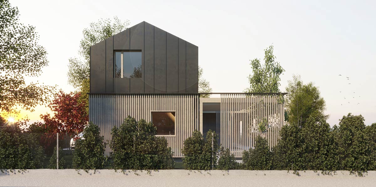 La copertura del piano terra è trattata come tetto verde, non praticabile se non per manutenzione e accesso agli impianti fotovoltaici, riaffermando una concezione del progetto in cui la tecnologia non è mai esibita ma integrata. Il volume superiore è concluso da una copertura a doppia falda, incisa da un ampio lucernario che porta luce zenitale nel cuore della casa, rafforzando il ruolo del doppio volume come spazio di mediazione tra i livelli. La scelta dei materiali contribuisce in modo decisivo alla lettura dell’edificio. Il piano terra è rivestito in listelli di legno non trattato, destinato a mutare nel tempo, a registrare il passaggio delle stagioni. Il volume del piano primo, compresa la copertura, è invece avvolto da una pelle continua in lamiera di alluminio aggraffata: una distinzione netta, quasi didascalica, tra basamento e corpo superiore, tra materia naturale e superficie industriale.