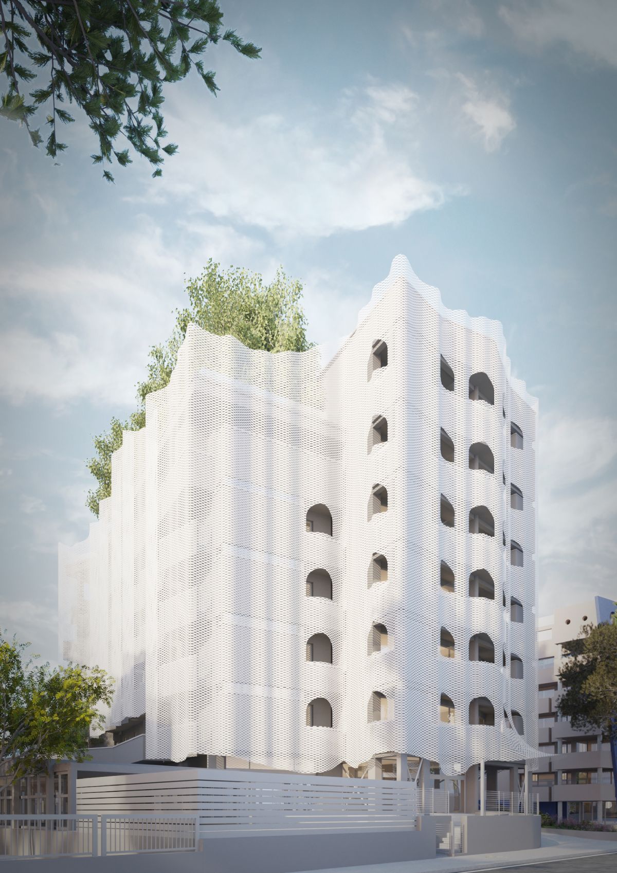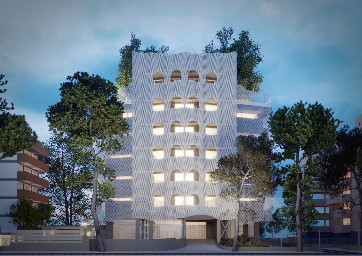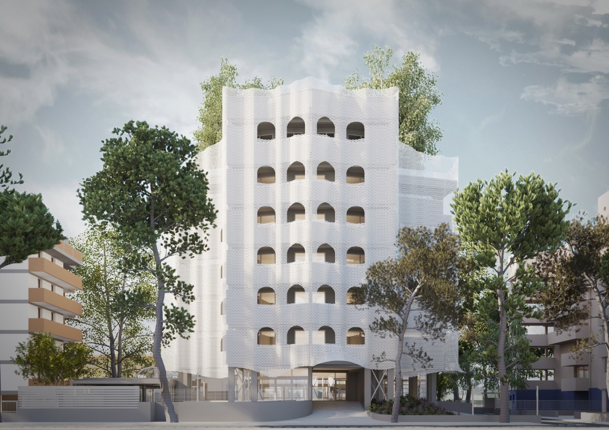 L’intervento riguarda il restyling delle facciate di un hotel posto sul litorale di Rimini, un’operazione che si inserisce nel solco della tradizione architettonica cittadina, dove il dialogo tra memoria e innovazione ha sempre definito l’identità del costruito. Il progetto, vincitore di un concorso di idee, si fonda su una metafora insieme semplice ed eloquente: quella di un vestito drappeggiato sull’edificio esistente, dove pieghe e tessitura ridisegnano il volto senza tradirne l’essenza. Questo nuovo involucro in lamiera stirata rappresenta non solo un omaggio all’eleganza del Liberty – lo stile floreale del primo Novecento – ma funge anche da dispositivo tecnologico per regolare la radiazione luminosa, migliorando significativamente l’efficienza energetica.