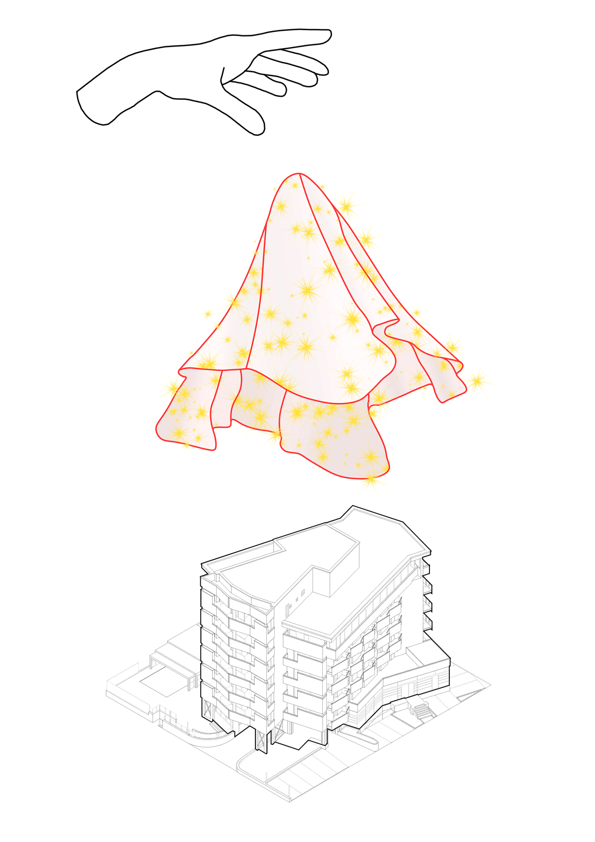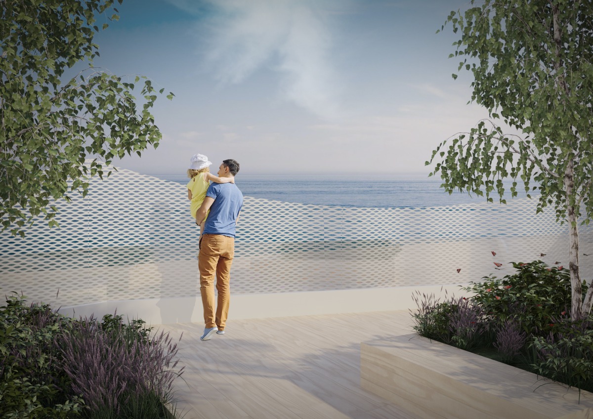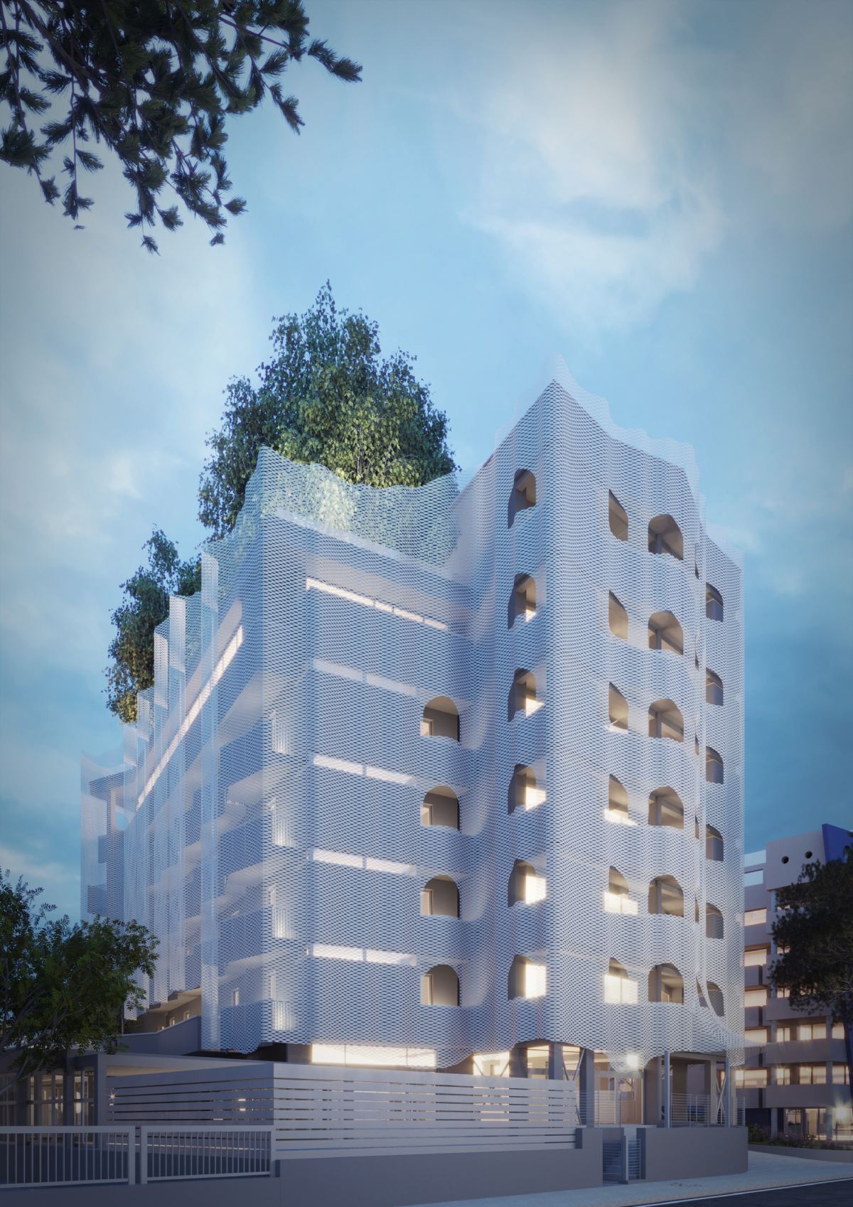 L’intervento riguarda il restyling delle facciate di un hotel posto sul litorale di Rimini, un’operazione che si inserisce nel solco della tradizione architettonica cittadina, dove il dialogo tra memoria e innovazione ha sempre definito l’identità del costruito. Il progetto, vincitore di un concorso di idee, si fonda su una metafora insieme semplice ed eloquente: quella di un vestito drappeggiato sull’edificio esistente, dove pieghe e tessitura ridisegnano il volto senza tradirne l’essenza. Questo nuovo involucro in lamiera stirata rappresenta non solo un omaggio all’eleganza del Liberty – lo stile floreale del primo Novecento – ma funge anche da dispositivo tecnologico per regolare la radiazione luminosa, migliorando significativamente l’efficienza energetica.