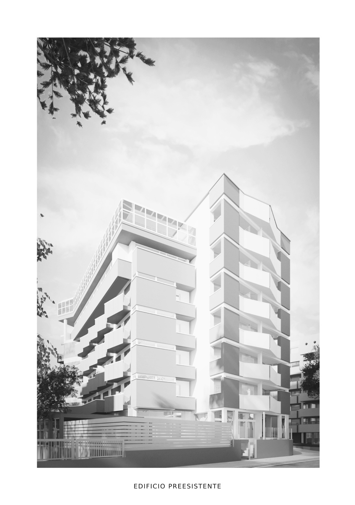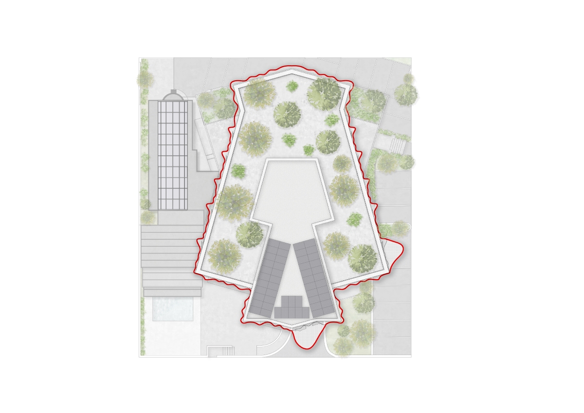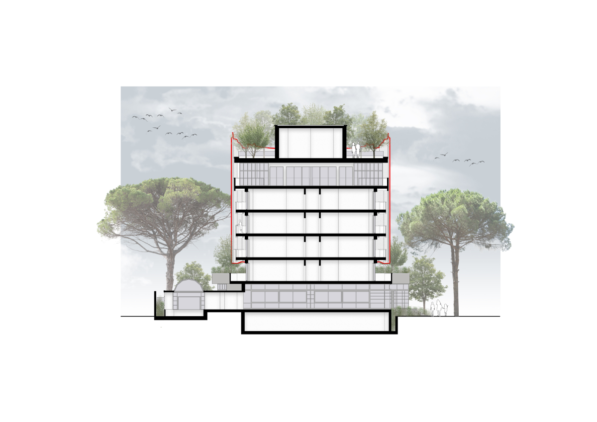 Completa l’intervento il tetto giardino, dove alberi ad alto fusto creano un sistema di ombreggiamento naturale, mitigando l’impatto solare sulla copertura e contribuendo al comfort termico. Questa soluzione, unitamente alla lamiera ventilata delle facciate, dimostra l’intenzione di coniugare qualità estetica ed efficienza prestazionale, minimizzando il ricorso a soluzioni tecnologiche invasive. In un contesto come quello riminese, dove l’architettura ha sempre plasmato l’identità dei luoghi, il progetto si propone come modello di riqualificazione consapevole – capace di proiettarsi nel futuro mantenendo saldo il legame con le proprie radici.
