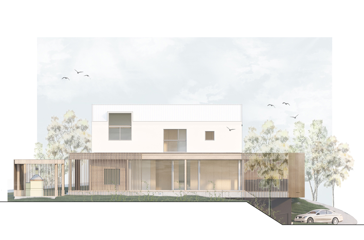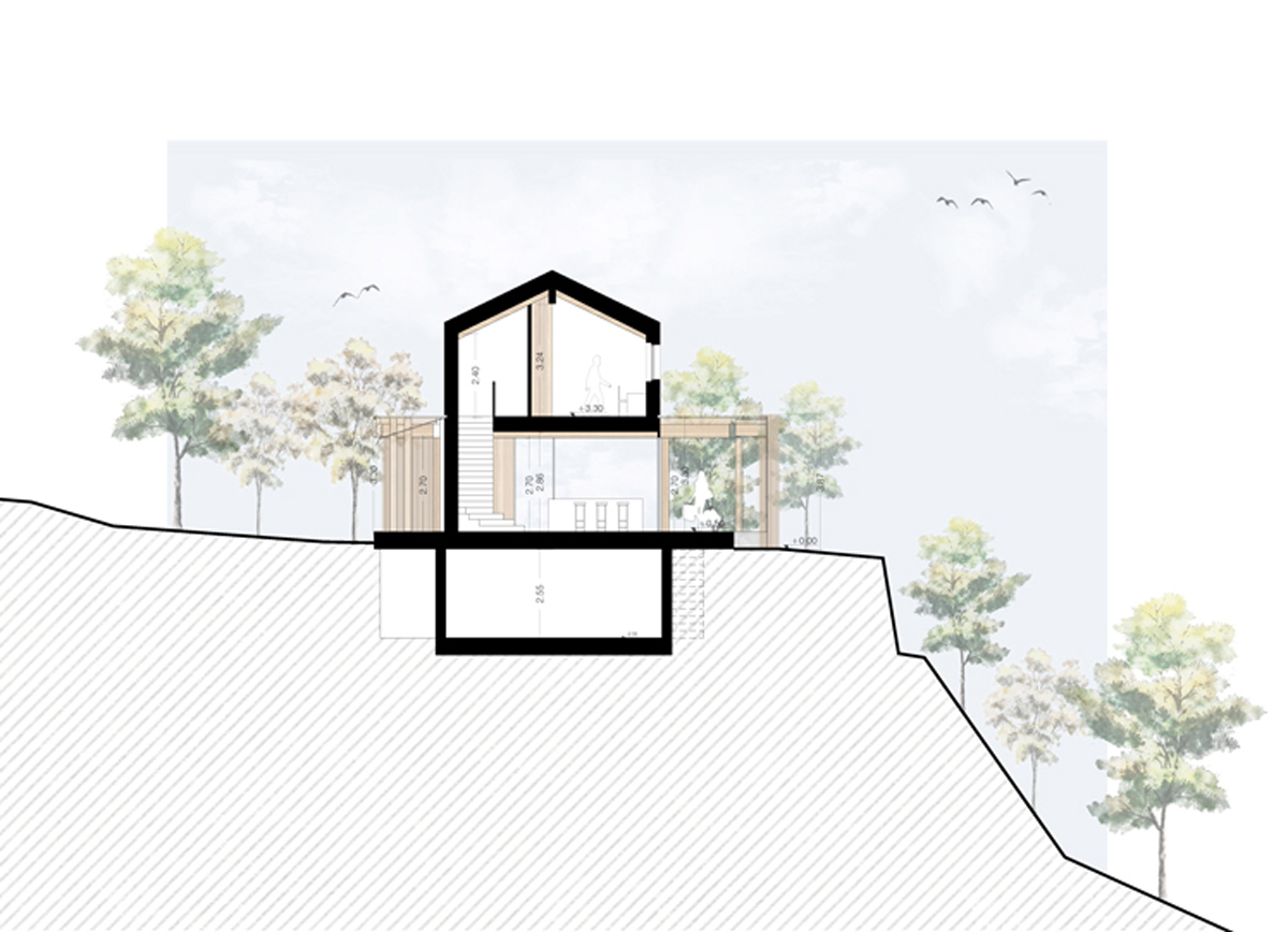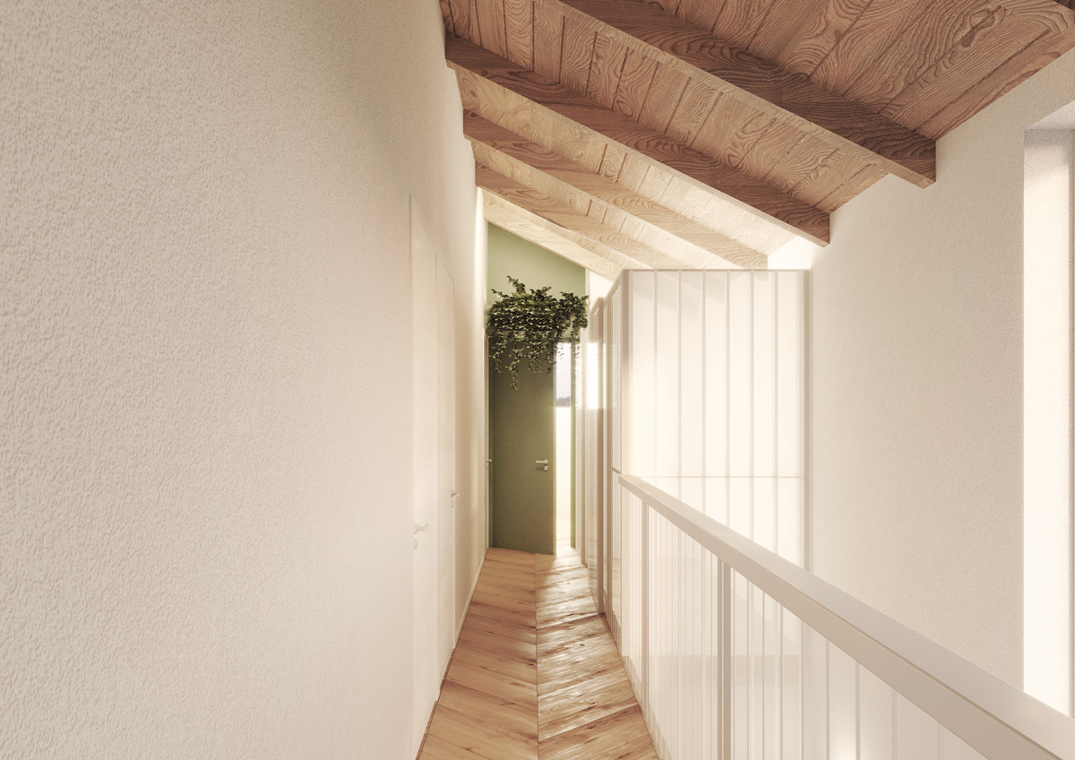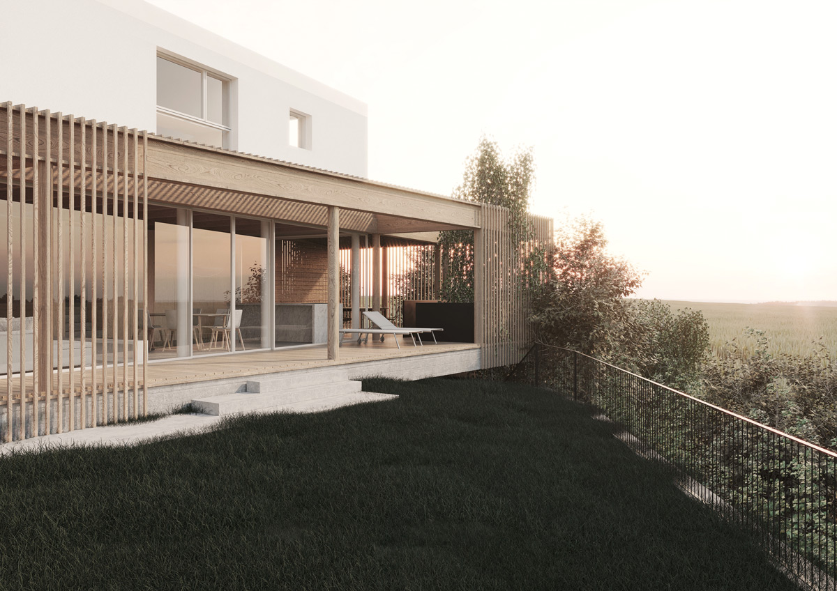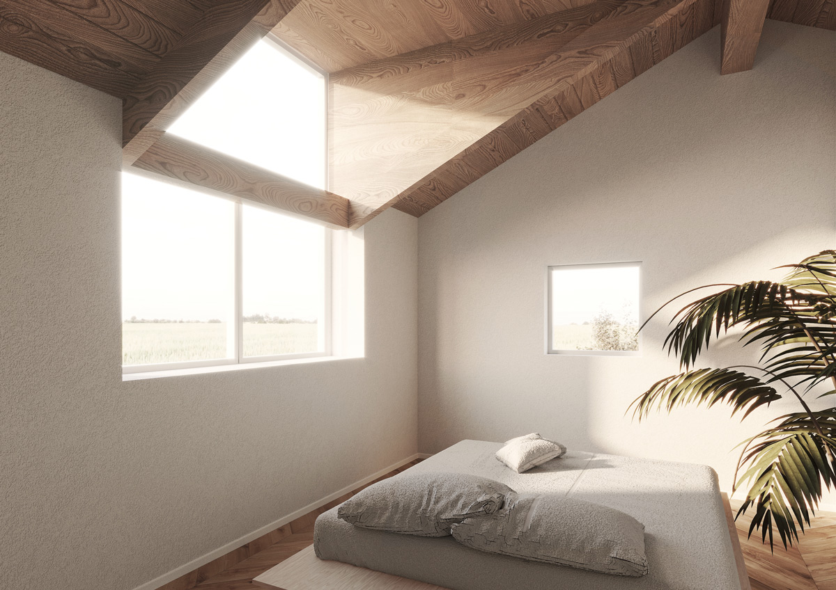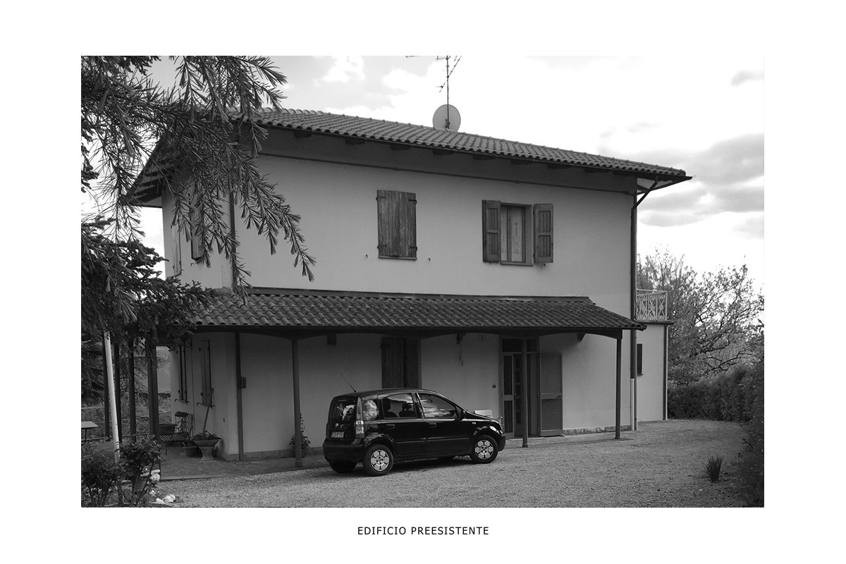 Il nuovo edificio è composto da un volume estremamente semplice con copertura a due falde, compatto, così da richiamare l’archetipo edilizio della della casa rurale così come si è definita nel territorio di riferimento. Grandi vetrate inquadrano il paesaggio massimizzando la visuale e la possibilità di connettere l’ambiente interno con l’esterno, instaurando un nuovo rapporto tra la vita domestica ed il paesaggio di campagna.