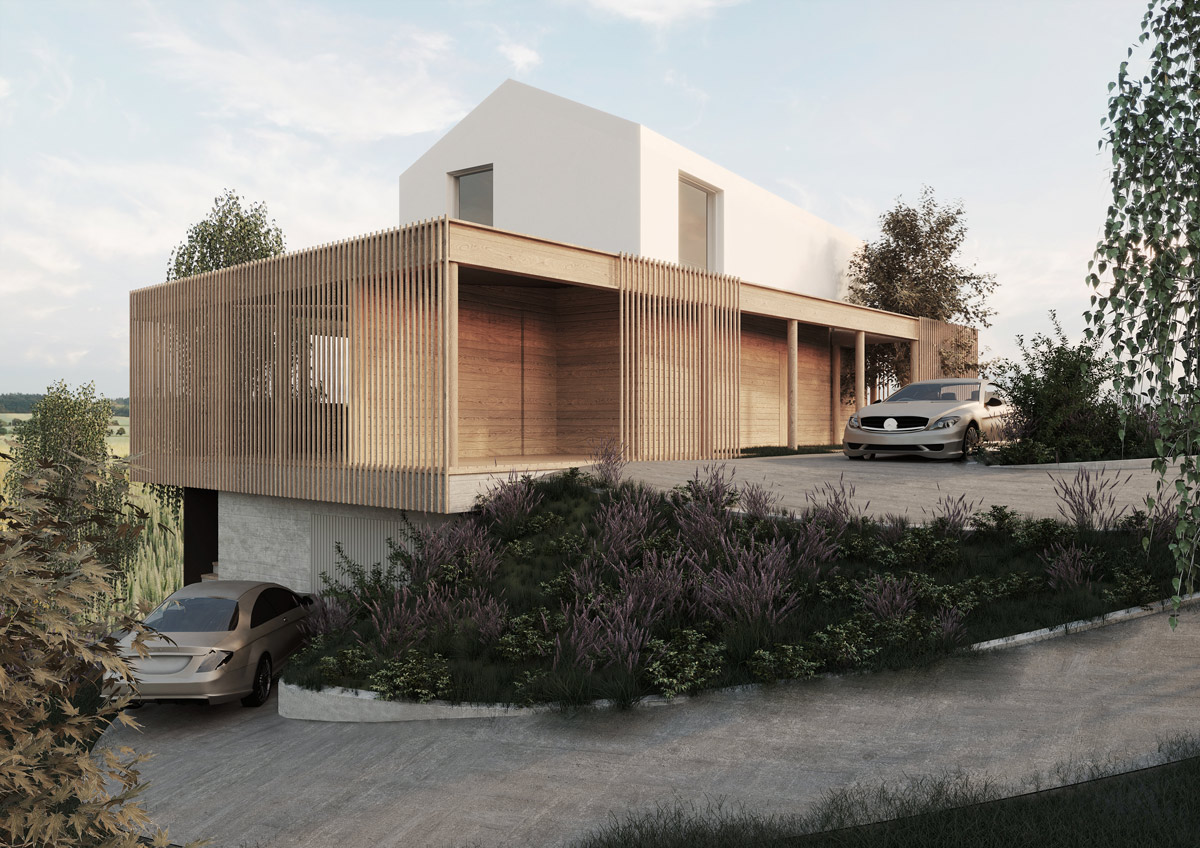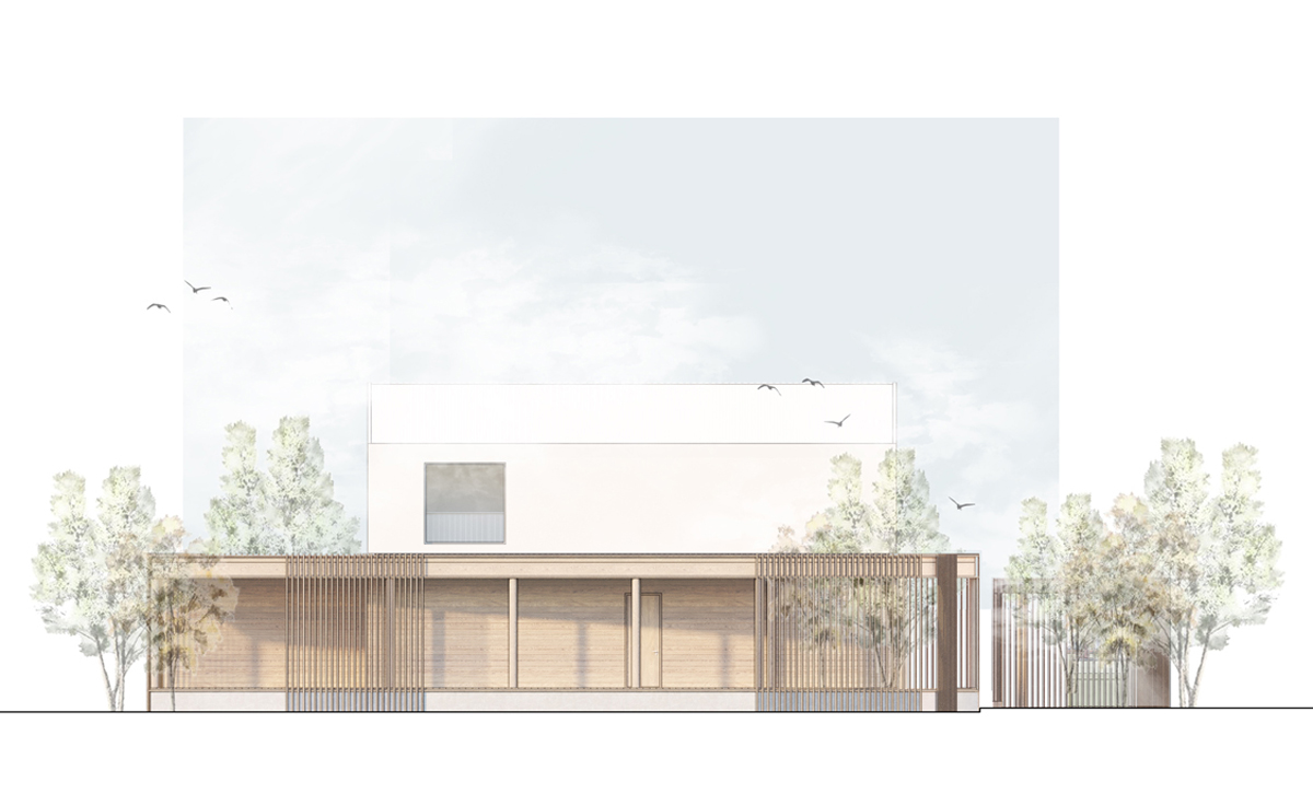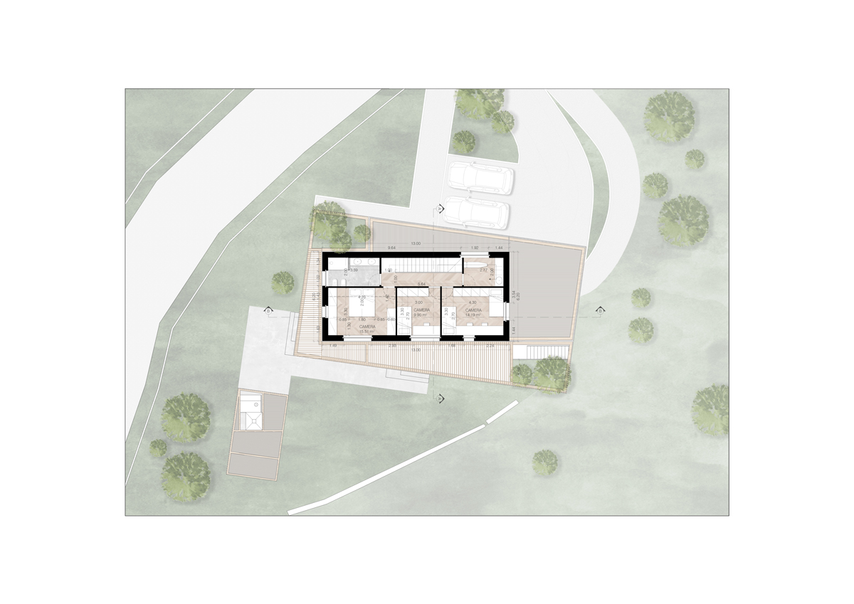 Al piano terra l’edificio viene intersecato da un secondo volume, connotato dalla presenza di legno naturale e ruotato in direzione delle emergenze paesaggistiche. Il volume ligneo assolve a diversi requisiti funzionali: funge da regolatore della radiazione solare, facilitando l’ingresso del sole in inverno e l’oscuramento in estate; genera spazi porticati attrezzati senza soluzione di continuità tra interno ed esterno dell’edificio. Sotto l’aspetto emozionale, il sistema di frangisole in legno che ne definisce le facciate, genera una immagine dinamica ed evanescente dell’edificio all’alternarsi di ombre e luci lungo l’arco del giorno.